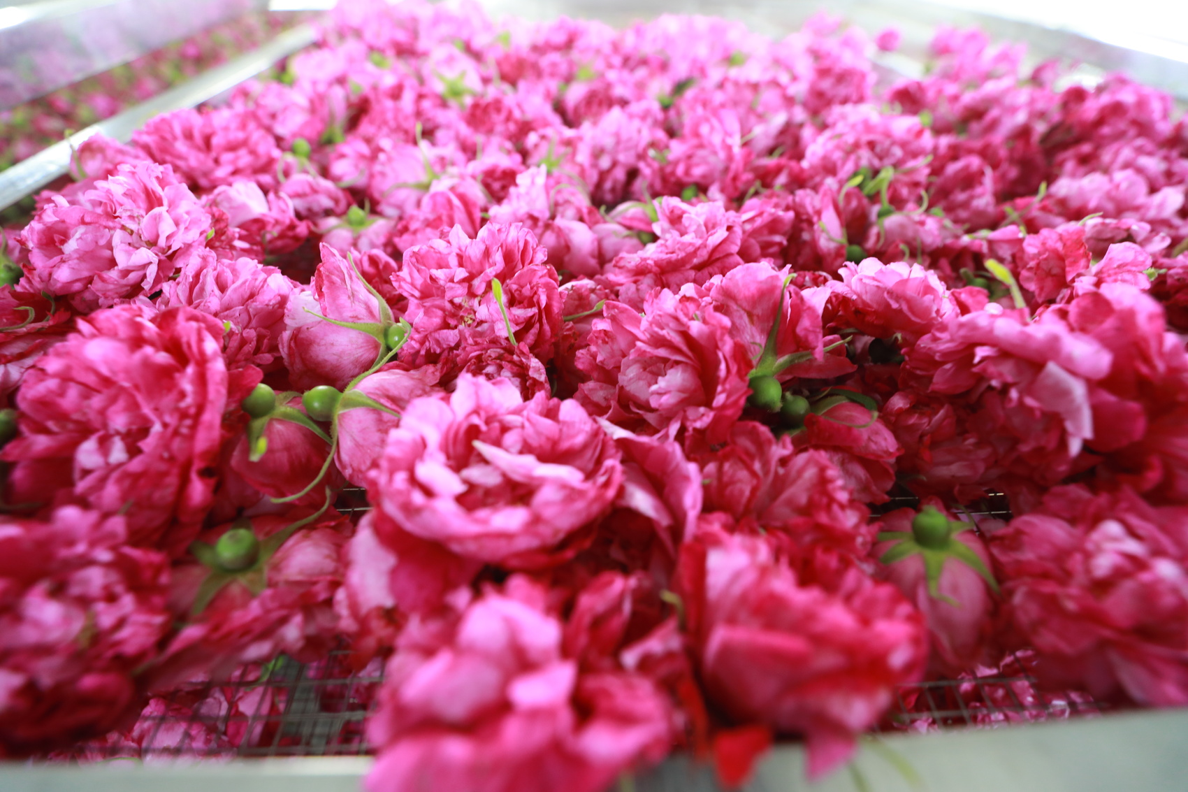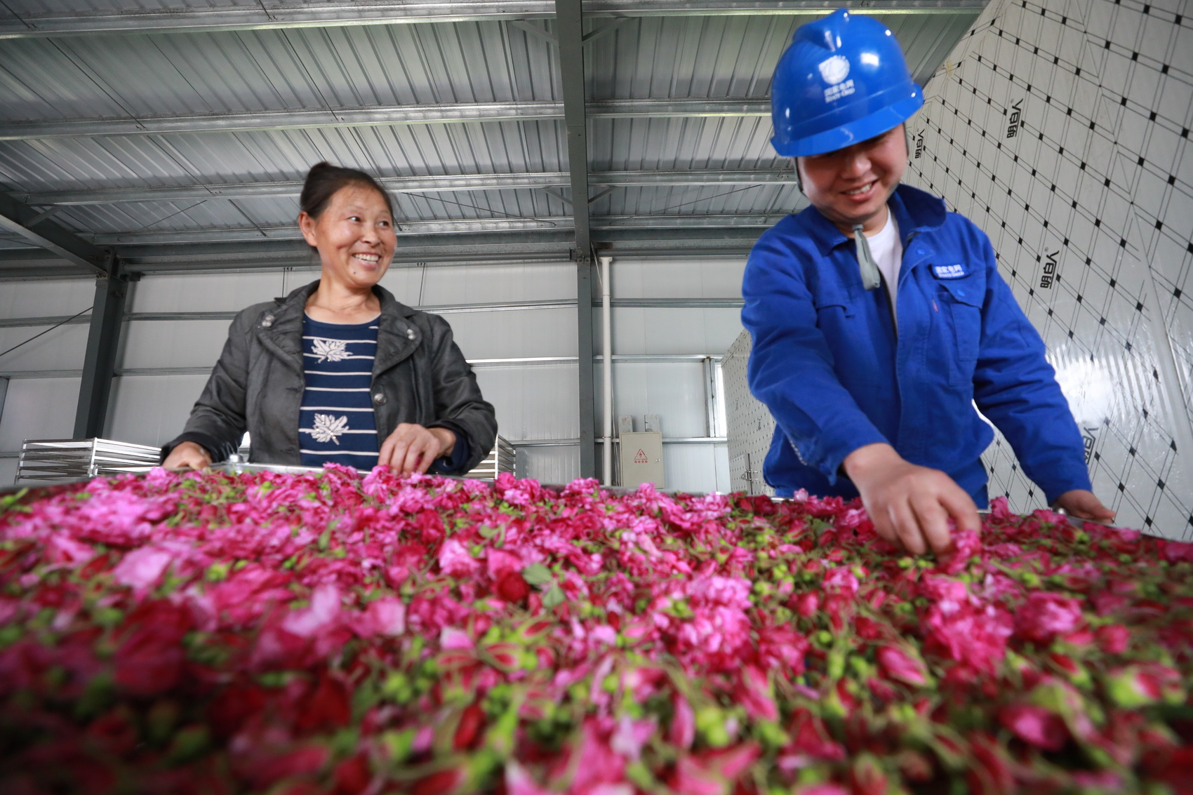据千岭村村支部书记韩家银介绍,一亩玫瑰地每年产800公斤鲜花,经过烘干后产出大约170公斤干花,今年两季的产值能够达到20吨左右,为村集体带来50万元经济收入。新鲜的玫瑰花经过深加工,可以制成玫瑰花茶、玫瑰花饼,其中价格最高、最稳定的是入药花蕾,会运往安徽毫州中药材市场统一收购。但玫瑰从花枝上采摘下的保鲜期极为短暂,需要迅速烘干,随着玫瑰产量的增加,村里今年在已有四台设备的基础上新增两台烘烤机。