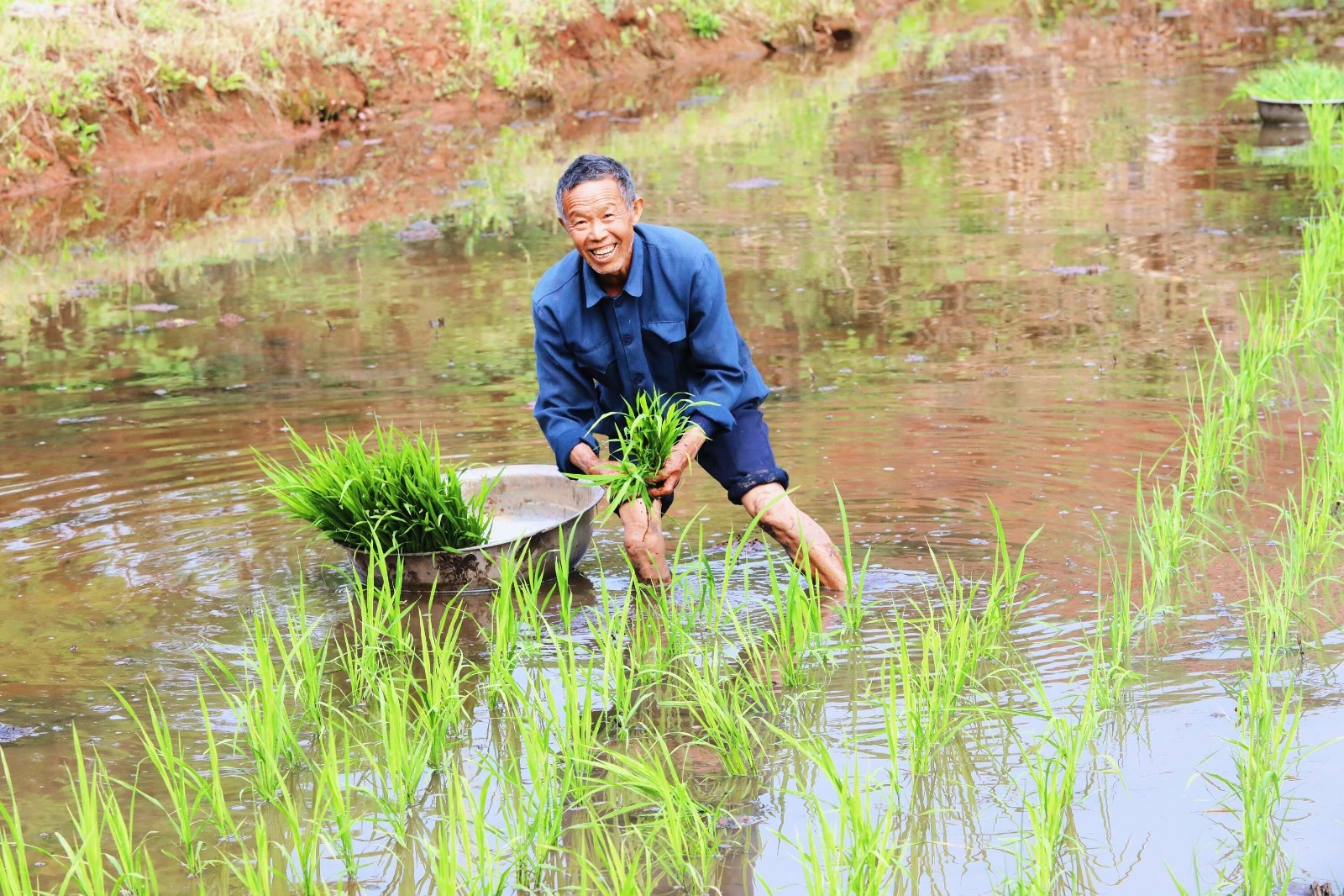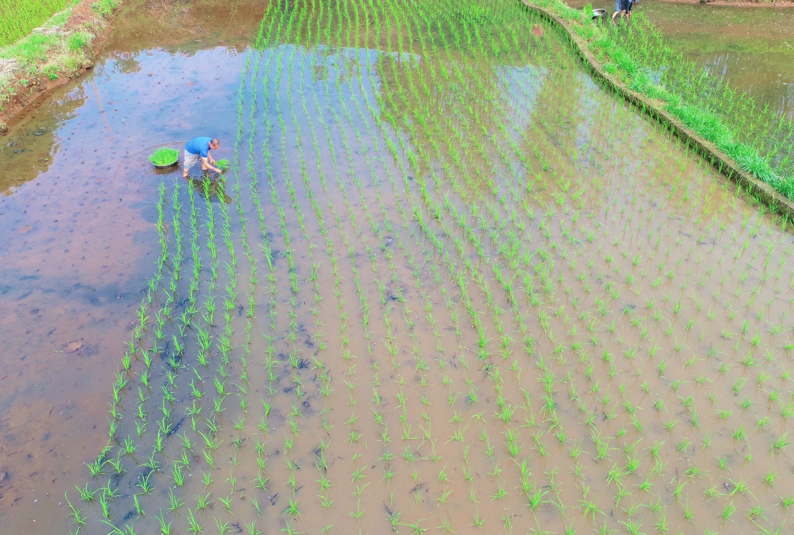 相隔不远处,前来帮罗琼家插秧的亲戚家人们正在水田里忙碌着,一株株青翠的秧苗被整齐有序地插进水田中,在微风的吹拂下展现出勃勃生机,预示着今年的丰收好前景。