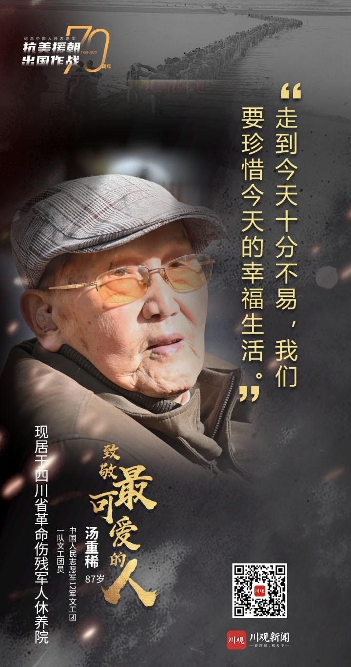 “负伤失去右手后,父亲以坚韧不拔的毅力潜心音乐创作,展现了一名革命战士英勇顽强,永远战斗的革命精神和热爱党,热爱祖国的赤诚之心。“10月21日,抗美援朝老兵汤重稀的儿子汤颂在陪伴父亲时说,父亲的这种精神成为指引他一生的“明灯“。