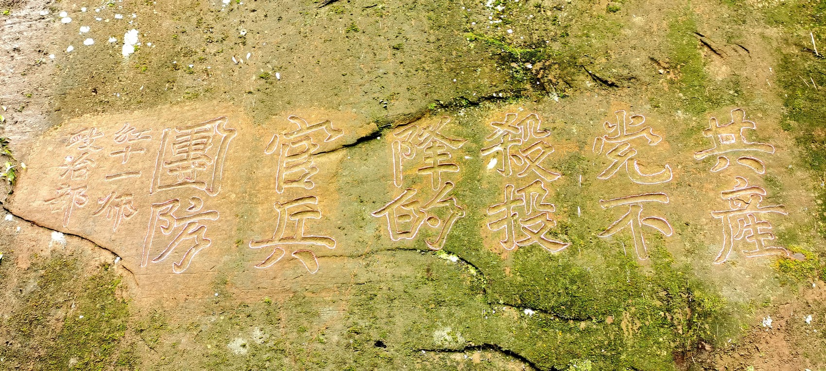 经过一个多小时的反复寻找,调查组终于在一处藤蔓和灌木掩映中的巨石上发现了标语,经过仔细清理,第二幅石刻标语也完整呈现出来,为“共产党不杀投降的官兵和团防”,落款与第一幅石刻标语相同。