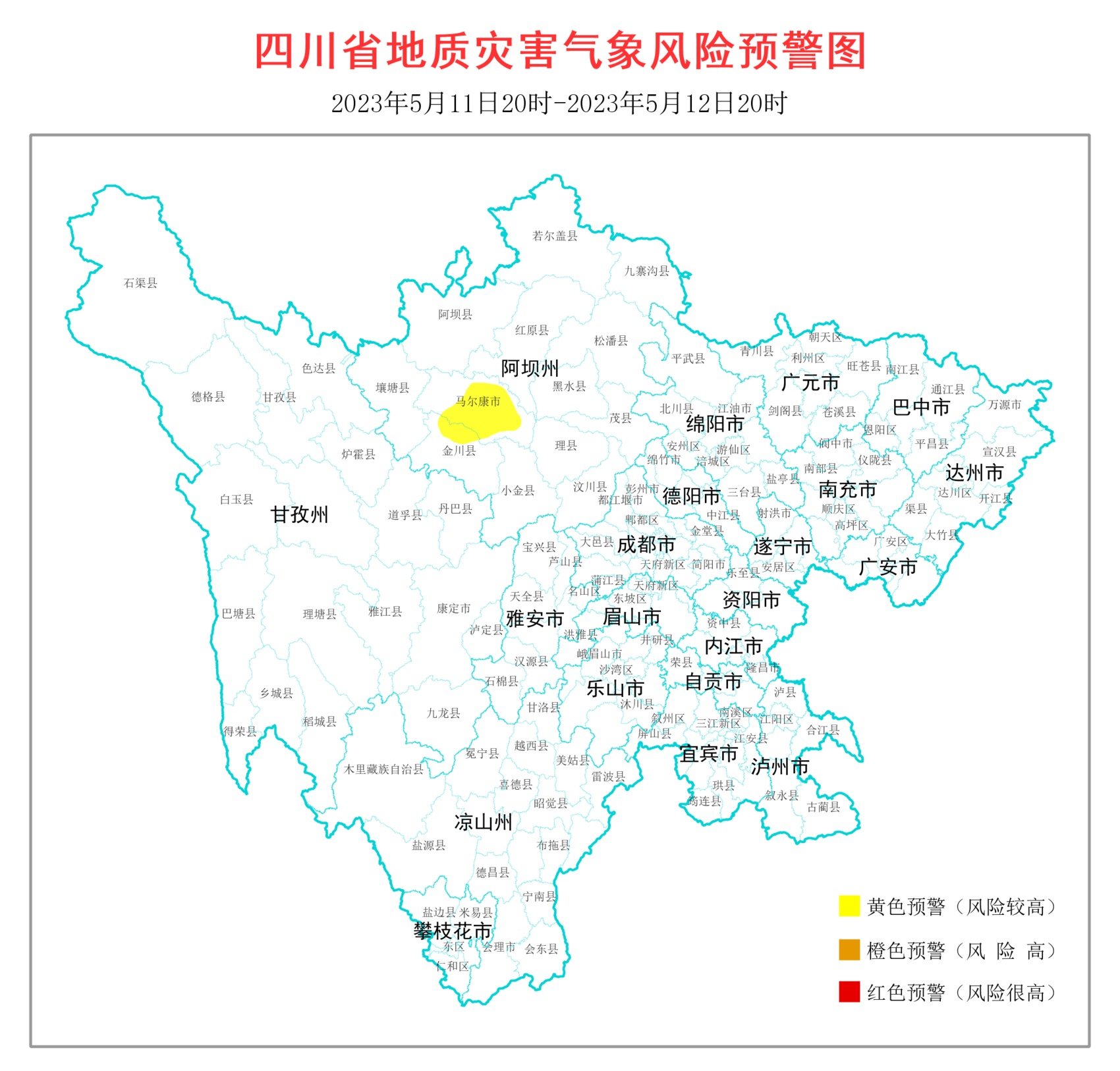 5月11日,四川省地质灾害指挥部办公室发布全省地质灾害气象风险预警。根据四川省地质环境条件,结合四川省气象台天气预报情况,5月11日20时至5月12日20时,地质灾害气象风险黄色预警区域为阿坝州马尔康市、金川县。