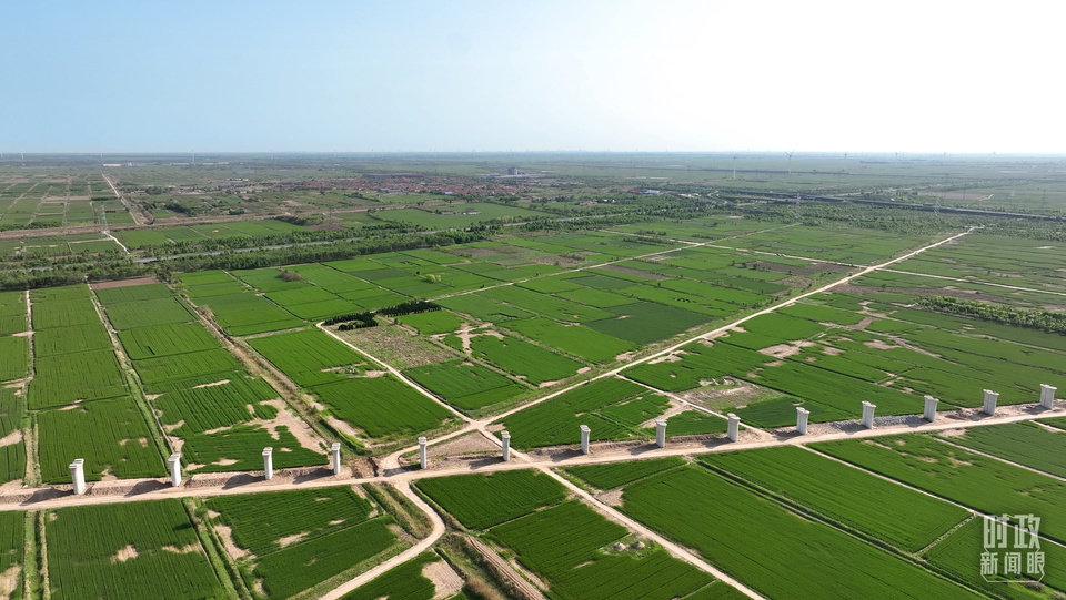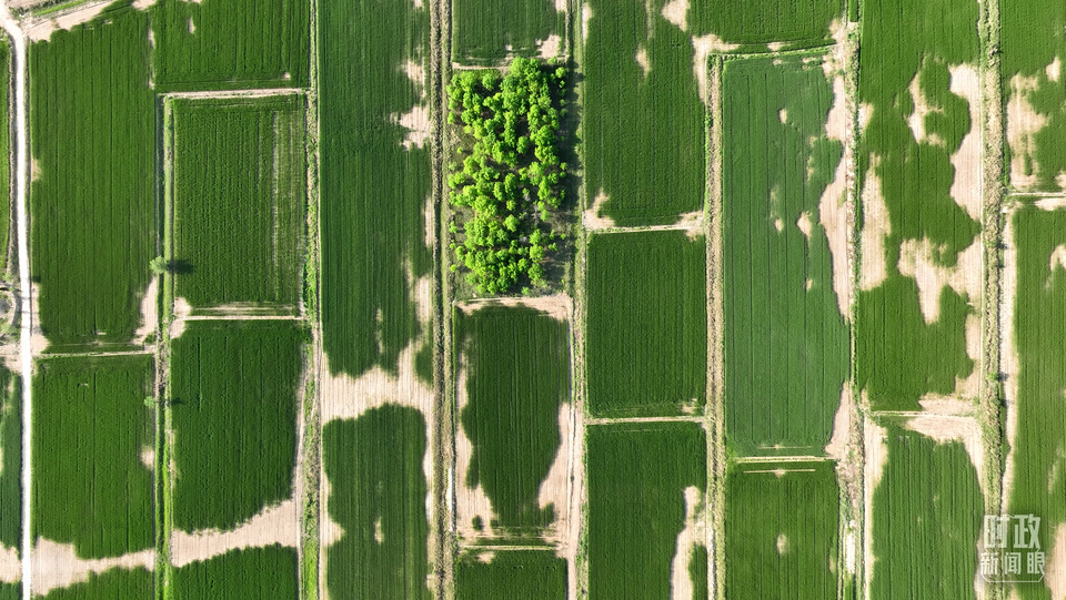 △旱碱麦田被分割成整齐划一的绿色方块。(总台记者郭永良拍摄)