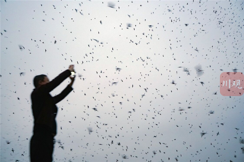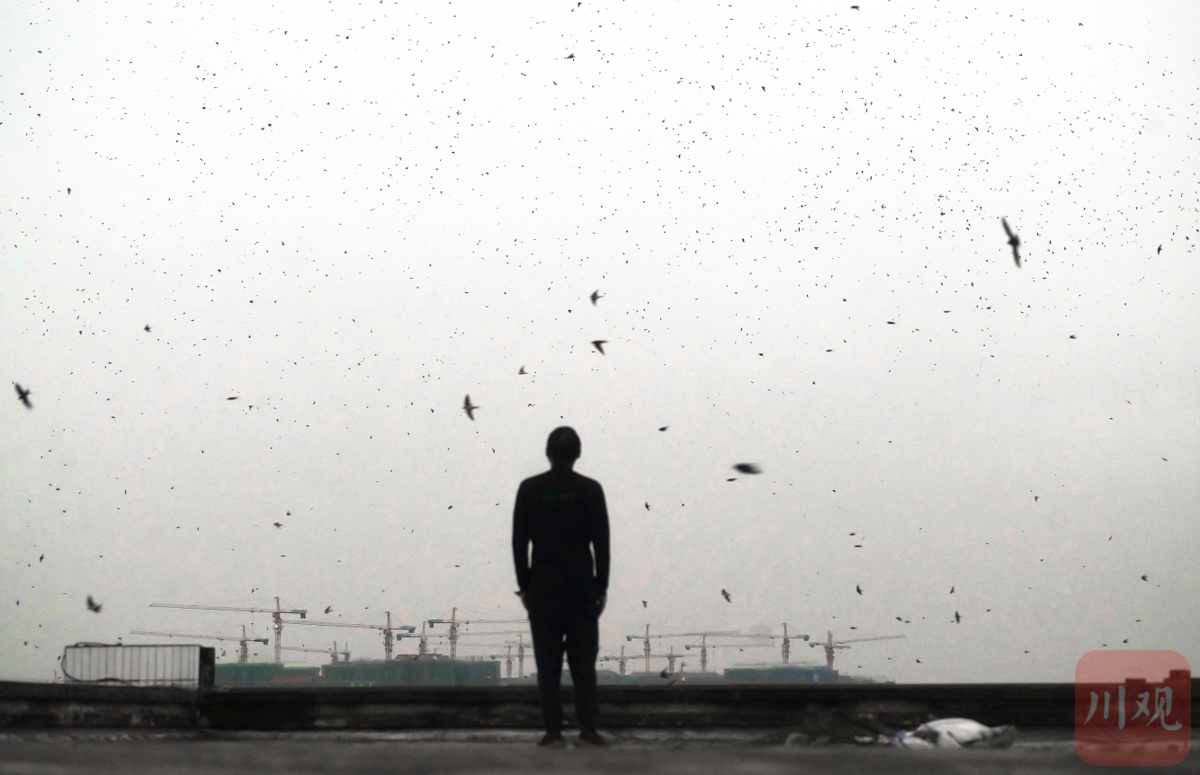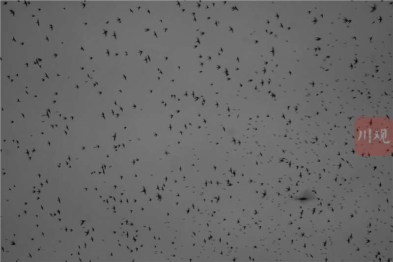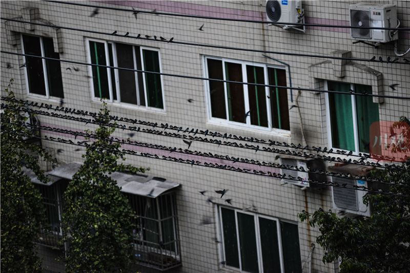 每天清晨和傍晚时段,成都市青白江区城厢镇下北街,就成为鸟的世界:成千上万的小鸟飞舞盘旋于行道树和居民楼上空。