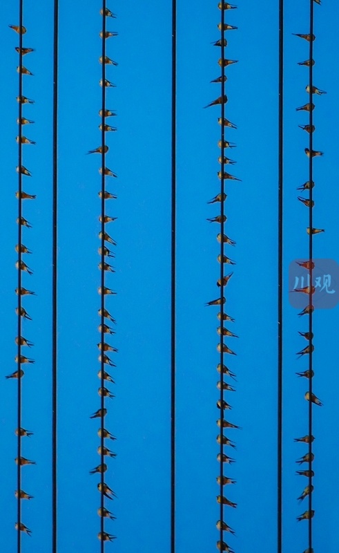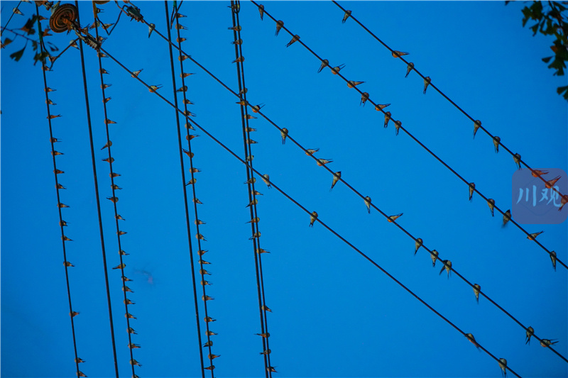 “傍晚这个时候,鸟儿是最多的,上万只随便有。”马先生指着两条横跨街道的电线说,此时电线上已有数百只小鸟落脚,整齐地排成两排,时而俯首低语,时而仰头眺望。