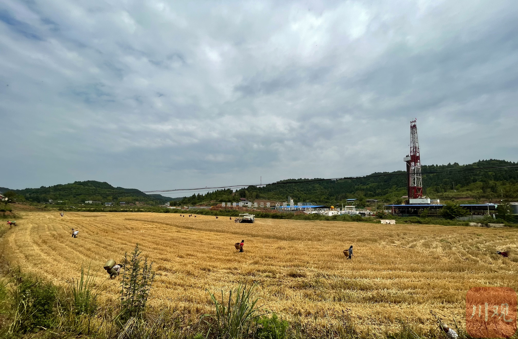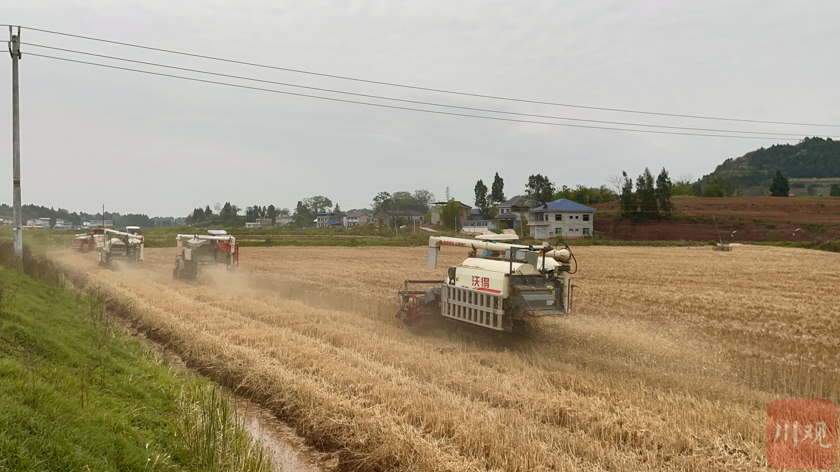 5月12日上午,资阳市雁江区丹山镇楠木村、两河村,8台大型收割机驰骋在金色的麦浪中。伴随着机器的轰鸣声,一颗颗饱满的麦粒从收割机仓门倾泻而下,随后被送进拉粮车。