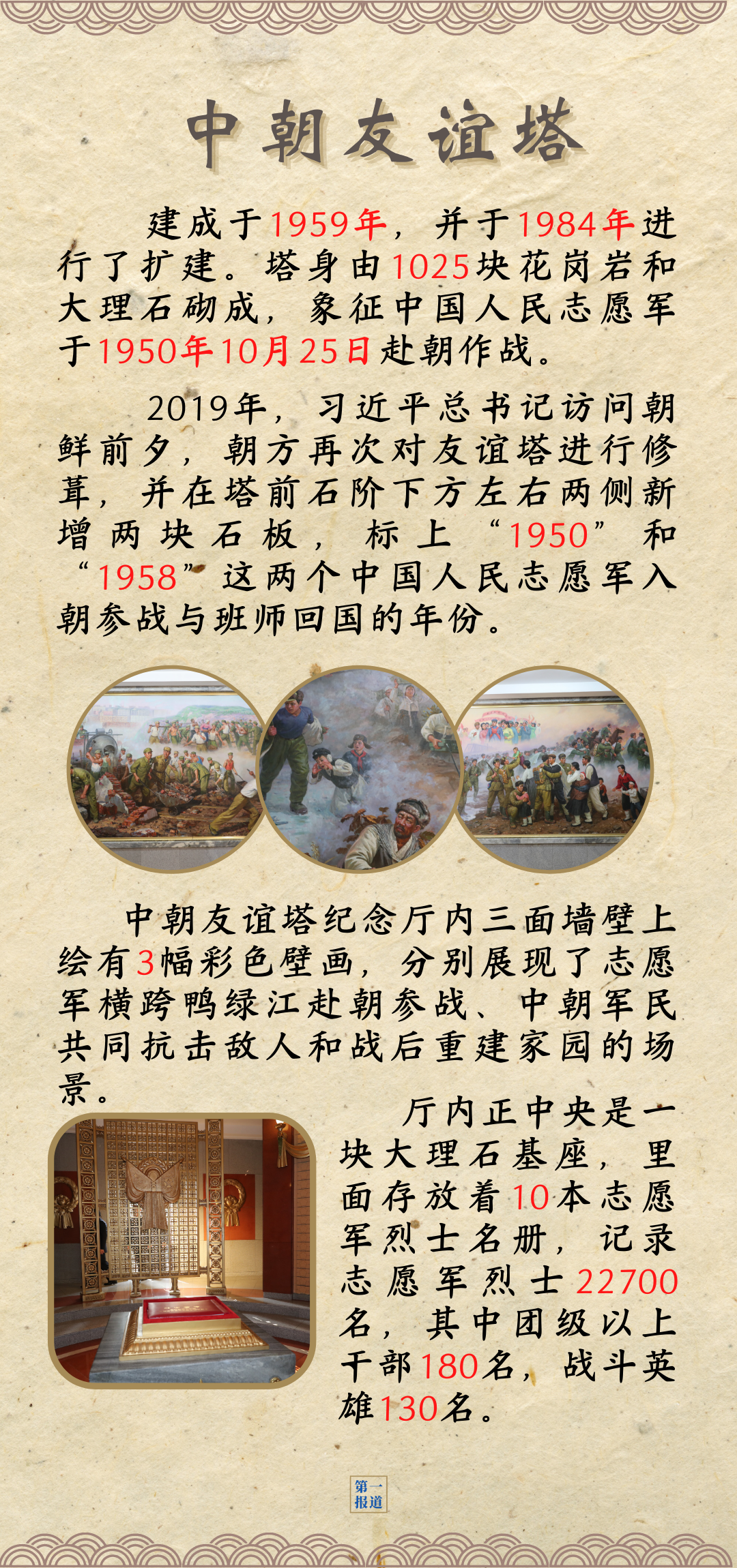在中朝友谊塔纪念厅内,入朝作战、并肩作战、战后重建,3幅彩色史诗壁画,唤起中朝两国人民共同奋战的难忘记忆。