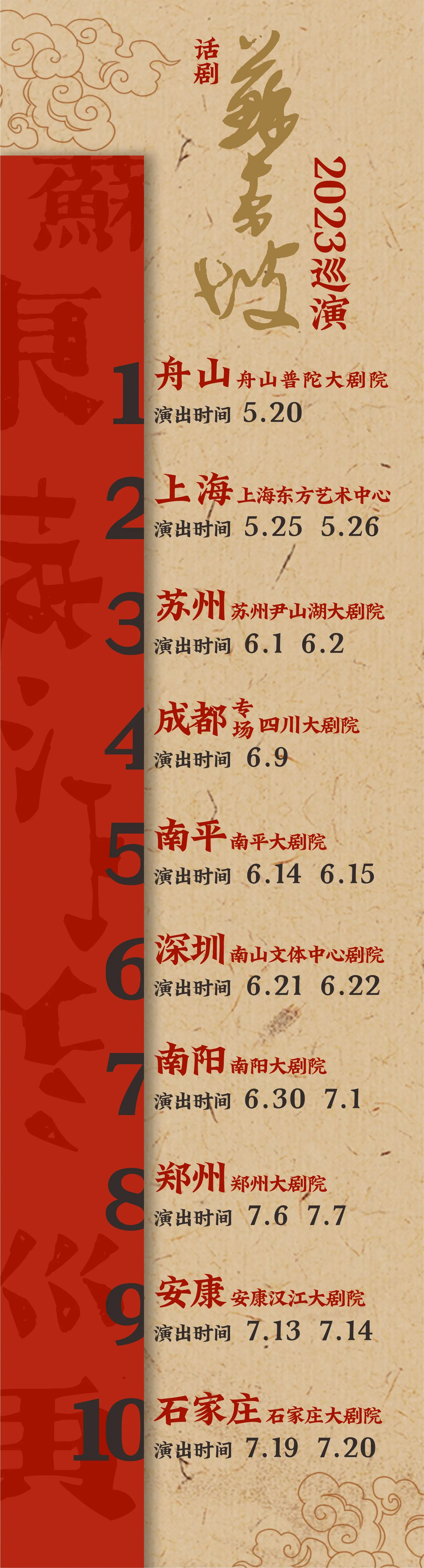 本次巡演城市包括了上海、深圳等一线城市。据了解,剧组将在上海巡演站邀请国内研究苏东坡的权威专家和文化学者,一起为这部剧“点播”把脉,进一步冲击上海白玉兰戏剧表演艺术奖,希望把这部剧打造成四川人艺每年都能演出的经典剧目。在深圳站,剧组将为观众们准备明信片、票夹等苏东坡的系列文创产品,欢迎更多年轻观众能与这位从四川走出来的历史名人在剧场相遇,留下美好的纪念。5月20日,话剧《苏东坡》即将在舟山市开启新一轮历时60天的全国巡演。
