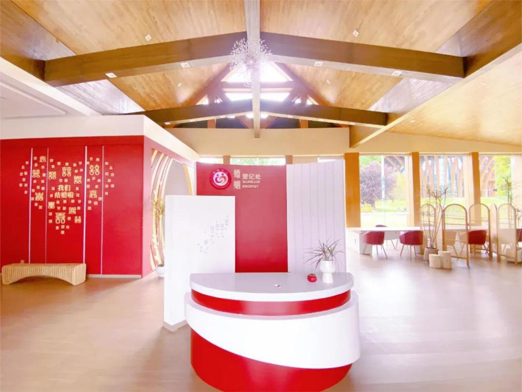 新津区天府农博园婚姻登记处是集婚姻登记、颁证、婚俗文化传承和推广为一体的综合服务体,整体设计风格为新中式,四面皆是落地窗户,内部通透、自然光线好,能多角度观览天府农博园自然风光,同时打造婚书墙、颁证区、打卡墙、等候区、填单区等场景,为领证新人提供一个舒适宽敞、温馨浪漫的公共空间。室内划分为登记、颁证、婚姻家庭辅导、档案存放等功能区,设置了茶水、化妆、更衣等服务区,还配备了智能自助婚姻登记终端设备,具有自助查档、人证核验、复印、打印等功能,为群众提供智慧高效便捷服务。