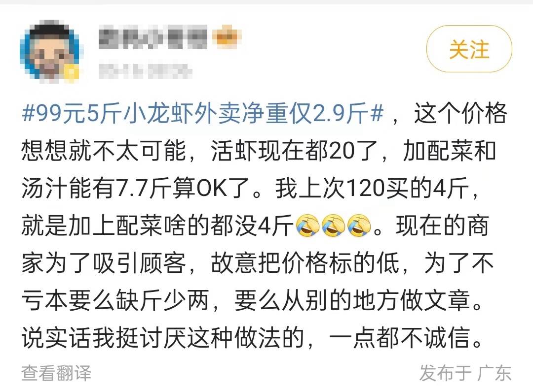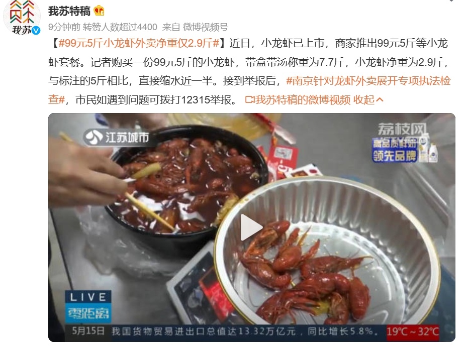 近日,有媒体报道称,商家推出99元5斤的小龙虾套餐。记者购买一份99元5斤的小龙虾,带盒带汤称重为7.7斤,小龙虾净重为2.9斤,与标注的5斤相比,直接缩水近一半。