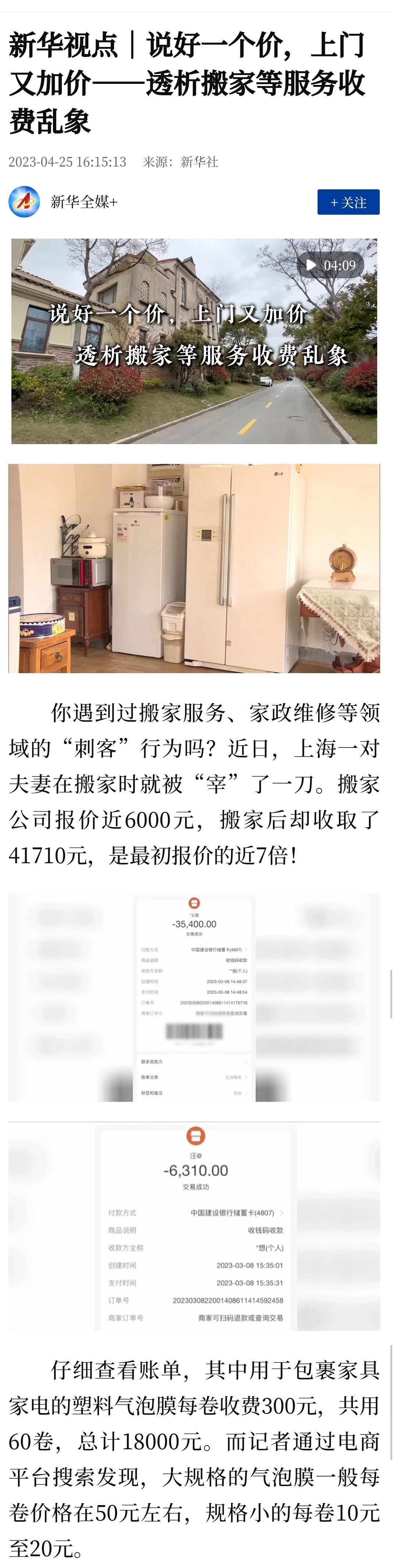 此前新华社曾报道,上海市民搬家遭遇“搬家刺客”,报价近6000元,最后却支付了超40000元,其中塑料气泡膜就有18000元。