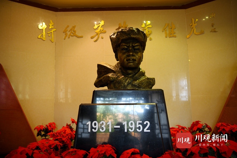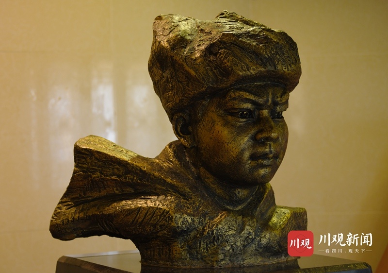 纪念馆讲解员曾欣告诉记者:“黄继光烈士因为早年家境贫寒,没有留下照片,所有的细节都是根据他的弟弟黄继恕的样貌为蓝本,由他的母亲邓方芝提出意见后修改,最终完成了这件作品。”