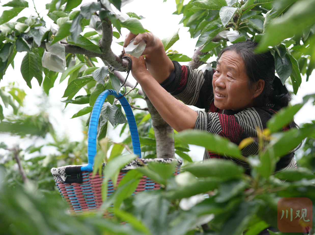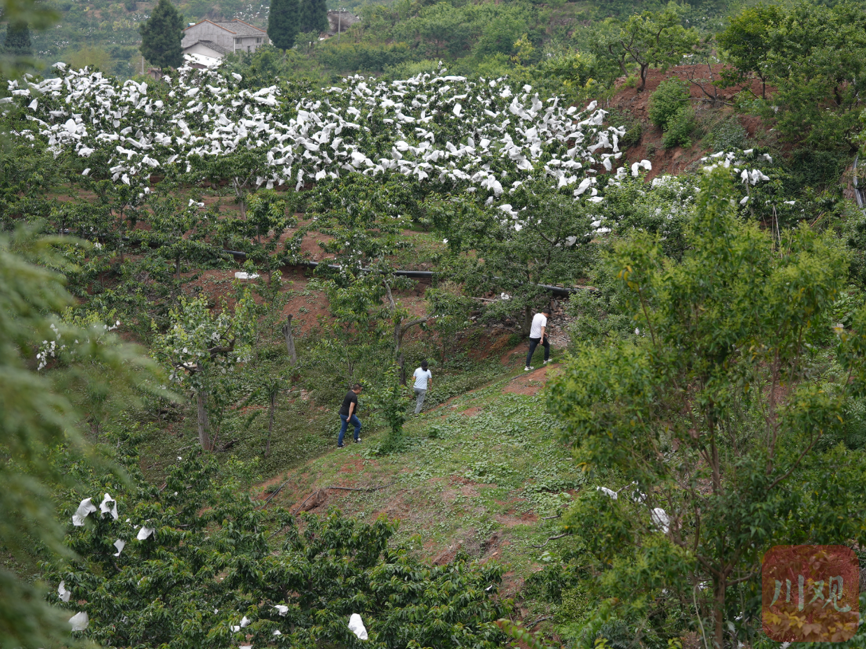记者了解到,目前全汉源县甜樱桃种植规模已达到6万亩,采摘时间依海拔从4月下旬至7月上旬,长达70到80天。在甜樱桃成熟后,如果遇到太阳暴晒或是持续降雨,果实将开裂,进而影响口感。果农通过给果实套袋和给果树铺设防雨布的方式保护甜樱桃,远远望去,就像白雪覆盖在山头。