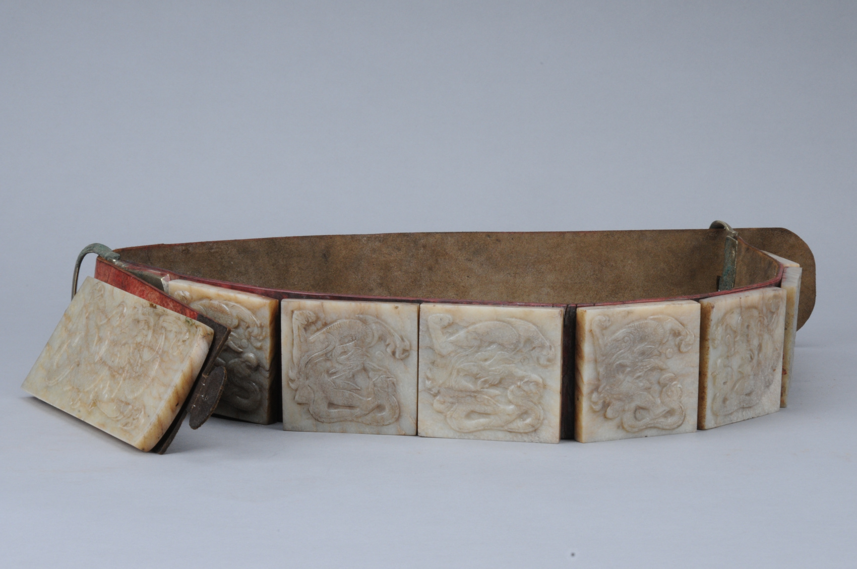记者看到,此次展出的永陵文物,包括了墓门上的鎏金铺首、鎏金铜饰片、鎏金铜门钉,中室棺床上的玉大带、银钵、镀银铜猪、银盒、银下颌托、银手杖、银刀鞘、银搔手、水晶珠、玉饰片、琥珀饰片、镜奁贴花,后室的谥宝及盛装谥宝的宝盝、哀册、盛装谥册的谥册匣、玉环等等。其中永陵出土的玉大带是一件兼具历史价值和艺术价值的国宝级文物。此带由七方銙、一方䤩尾、两节革带和一对银扣组成,䤩尾背面所刻铭文记载了玉大带火中幸存的故事。玉大带出土于棺床之上,可确认为王建遗体身佩之物。而王建的谥宝等文物,也最终帮助这座地上陵墓确认了身份。曾经,成都西郊这座地上陵墓曾被严重盗扰,至近现代被附会成司马相如的“抚琴台”。1941年刚开始发掘时,考古工作者们并不知道这座陵墓的主人是谁,直到出土了一套完整的哀册,哀册中出现的“永陵”、“嗣皇帝臣衍”字样,才让考古工作者们恍然大悟,原来这座陵墓是前蜀开国皇帝王建的“永陵”。