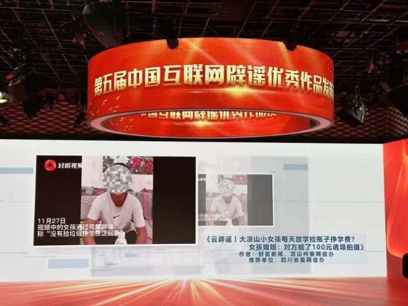 由凉山州委网信办、封面新闻制作的《云辟谣 | 大凉山小女孩每天放学捡瓶子挣学费?女孩姐姐:对方给了100元诱导拍摄》获得网络辟谣版块社会民生类奖项。