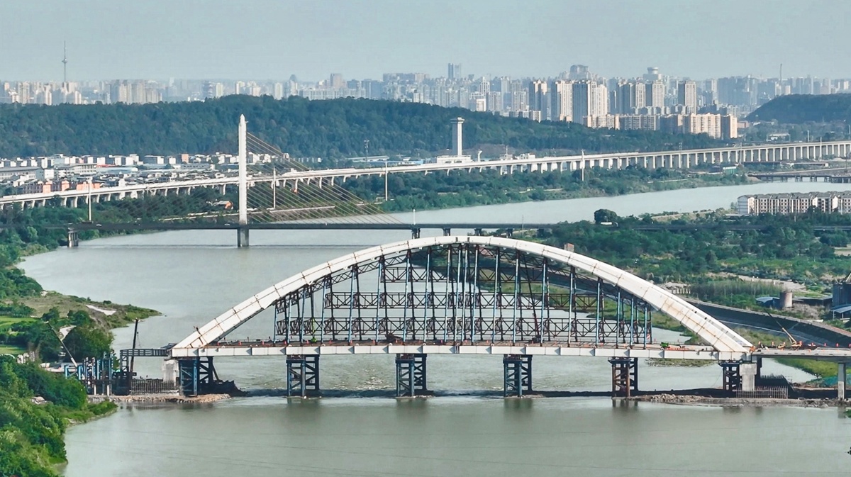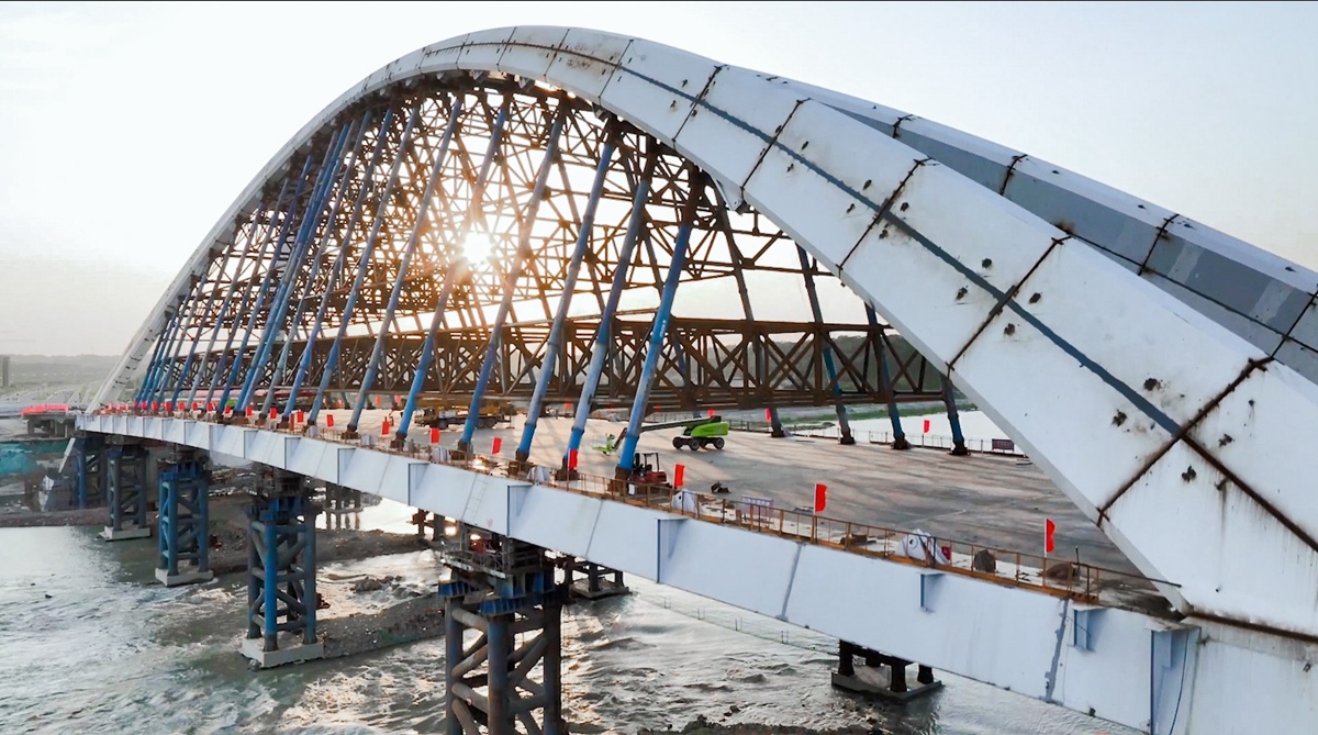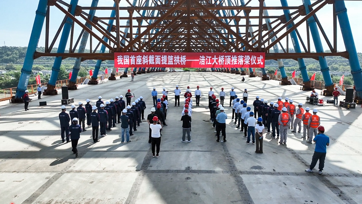 5月16日,随着重达一万四千吨、高度超过50米的巨型钢拱桥落梁就位,绵阳科技城涪江大桥宣告顶推成功。这是国内首座斜截面钢箱梁提篮拱桥,也同时刷新了同类桥梁超大体积重量和超长距离顶推架设的全国纪录。