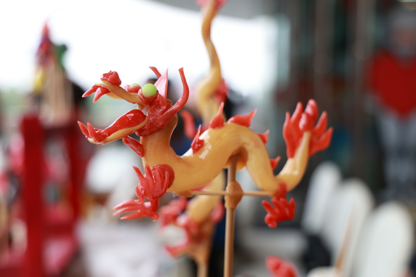 在汉安烙画旁的展位,73岁的黄祖全正在制作糖人,他是省级非物质文化遗产项目“黄氏吹糖人”技艺第5代传承人。一个板凳、一捆竹签、一把剪刀、一个熬糖瓜瓢、两根搅糖木棒……这是他展示技艺的全部工具。