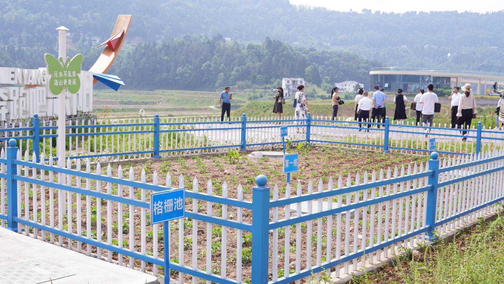而在海山村聚居点,道路旁有一小块空地被栅栏围着,里面种着农作物,如果不是一块竖立的宣传牌,你简直想不到这是一个污水处理点。