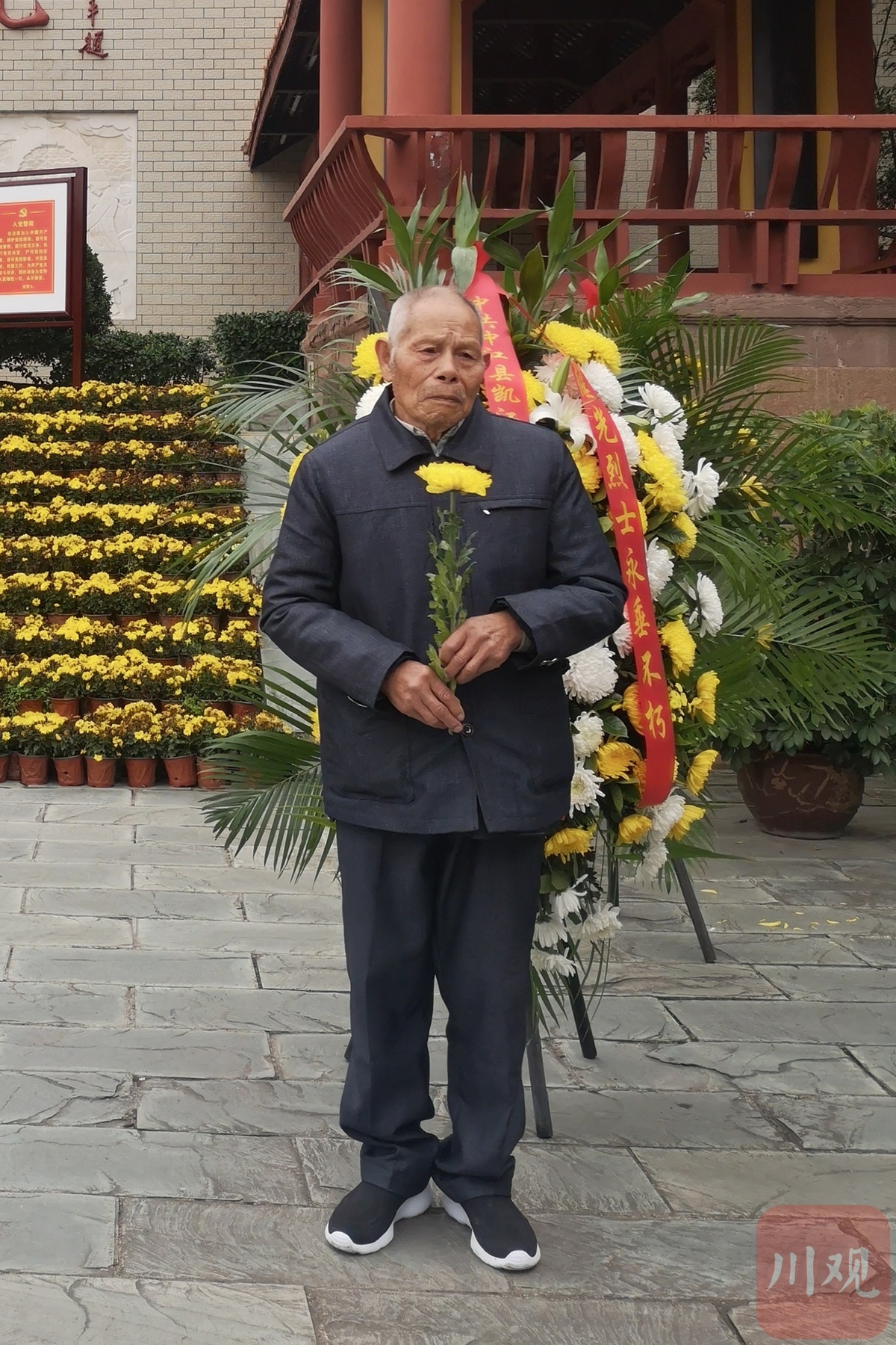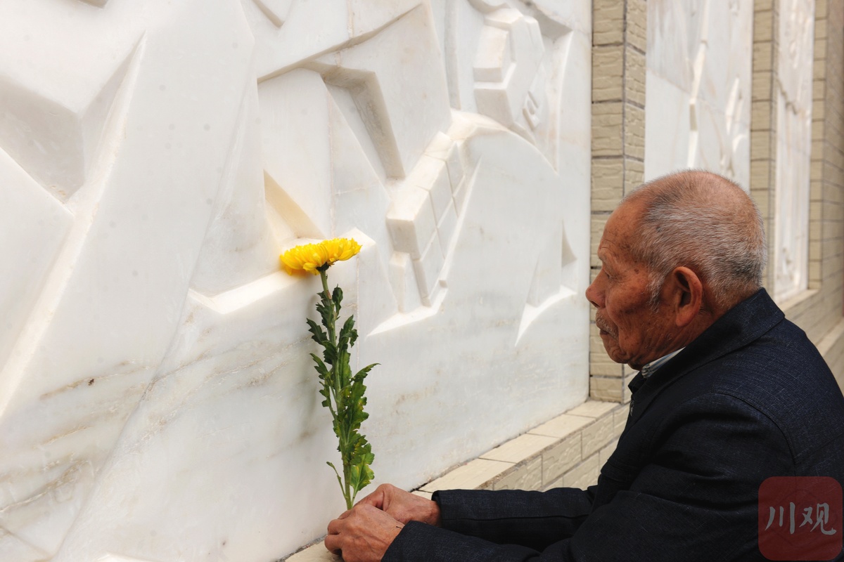 在现场,一位老人手捧菊花,在家人的搀扶下来到英雄雕像下,两手高高将菊花举过头顶,缓缓放下后,抚着雕像久久不愿离去。老人名叫李世廷,来自中江县南华镇苏坝村,今年93岁。1951年,他同黄继光一道跨过鸭绿江抗美援朝,被分到134团三营机炮连。