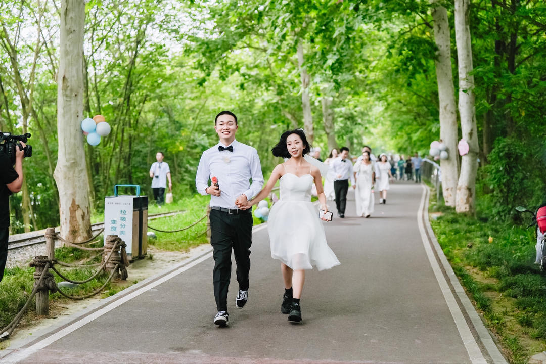 上午9点半,“5·20”爱乐跑拉开了活动序幕。新婚夫妇与“钻石婚”“金婚”“银婚”“铜婚”等纪念婚夫妇身穿西服和婚纱、唐装和旗袍,在6个不同的起点展开一场爱情接力赛,象征着爱的传承和延续,带着对彼此的祝福携手白头。