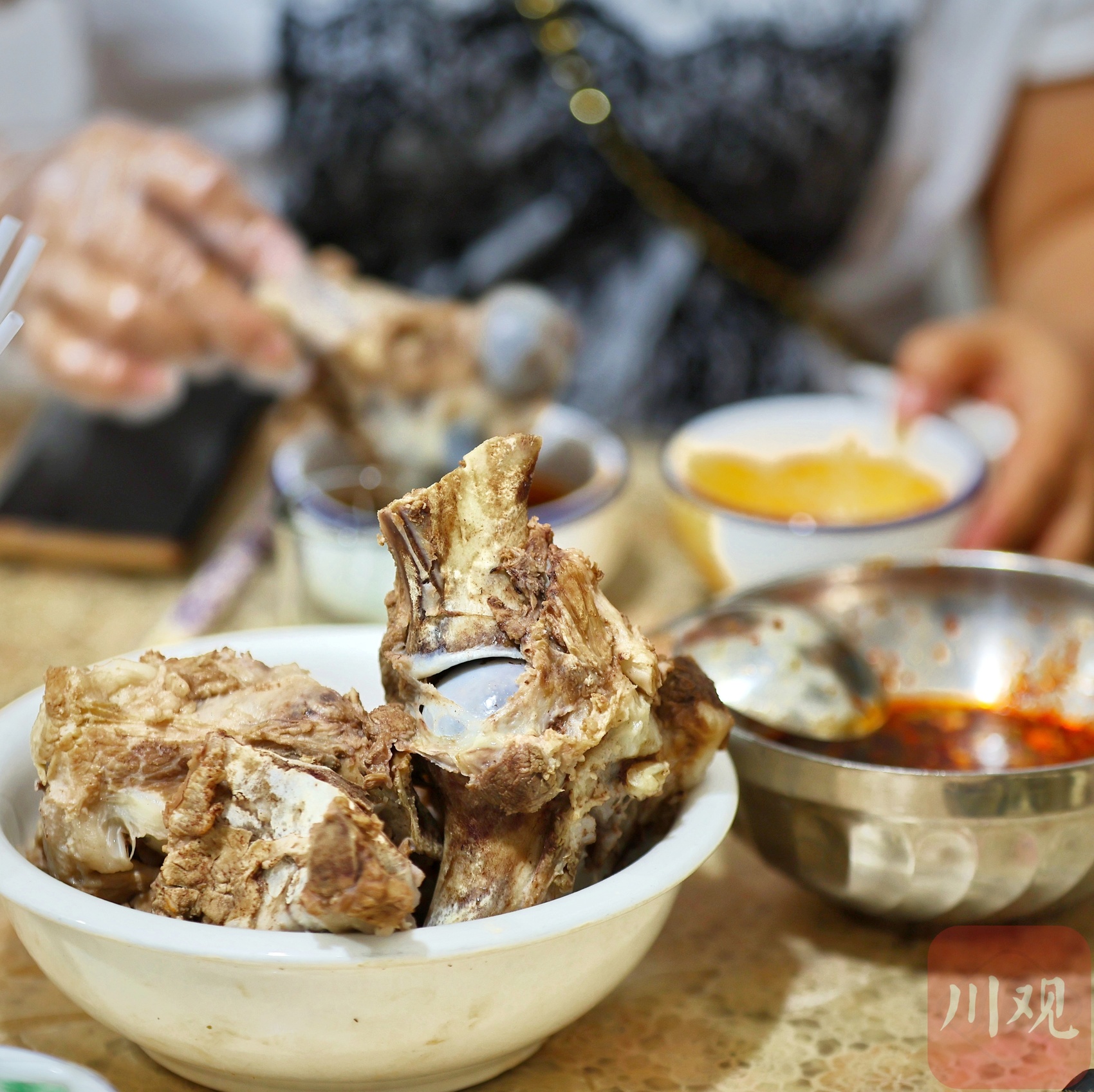 据了解,筒子骨就是猪的前后腿骨,在熬制过程中加入了食盐、三奈、白扣、香草、生姜等天然香料。各家都有不同的秘制配方,熬制的汤汁色白可口、香味扑鼻,附着在骨头上的肉和蹄筋更是香滑不腻,裹上店家的蘸料,让人回味无穷。当你啃完巴骨肉,再用吸管猛嘬骨髓时更是满足。