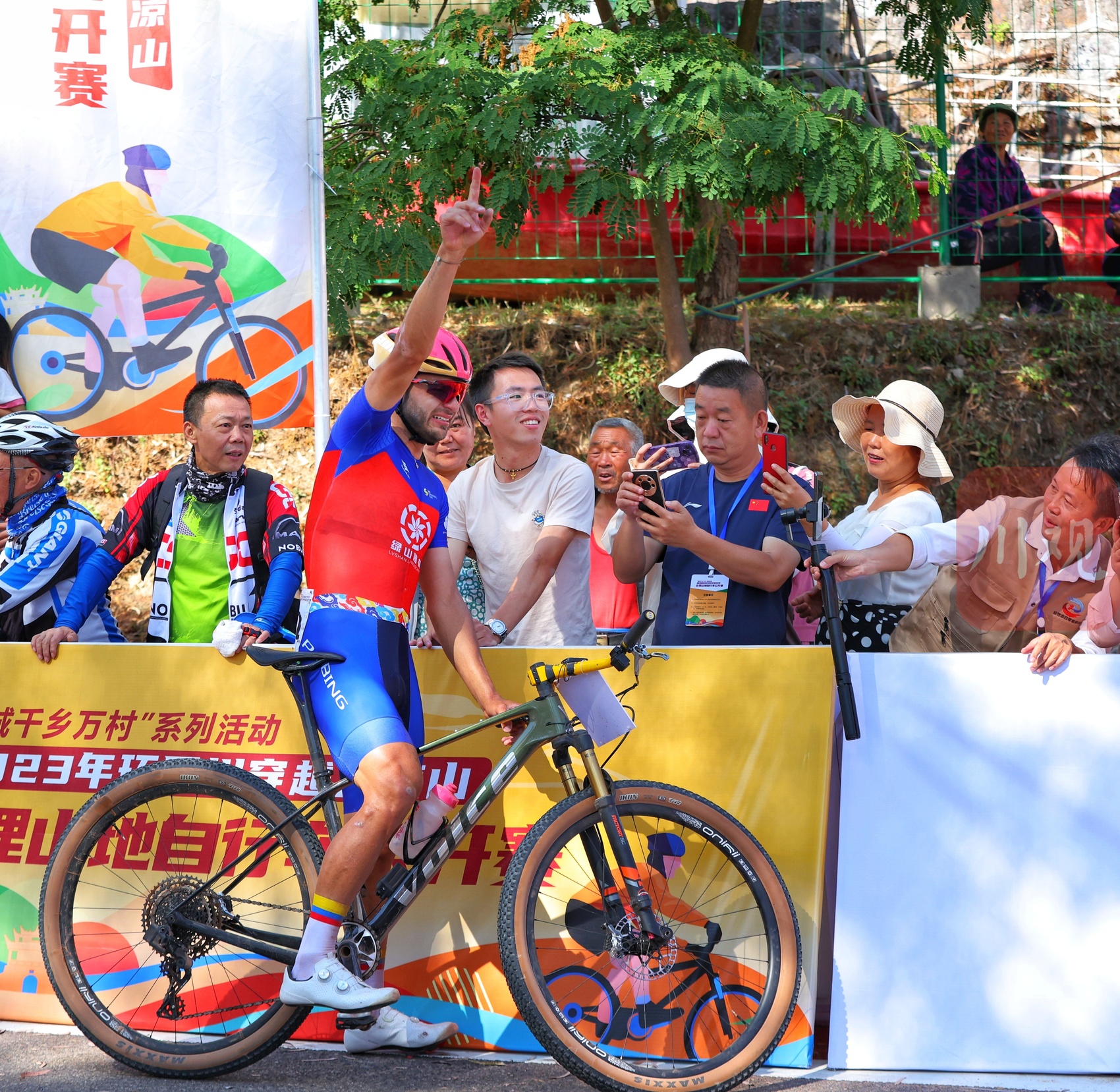 男子山地精英组冠军,哥伦比亚选手卢埃达(RUEDA TORRES NESTOR JAVIEF)正在与观众们合影。(华小峰 摄)