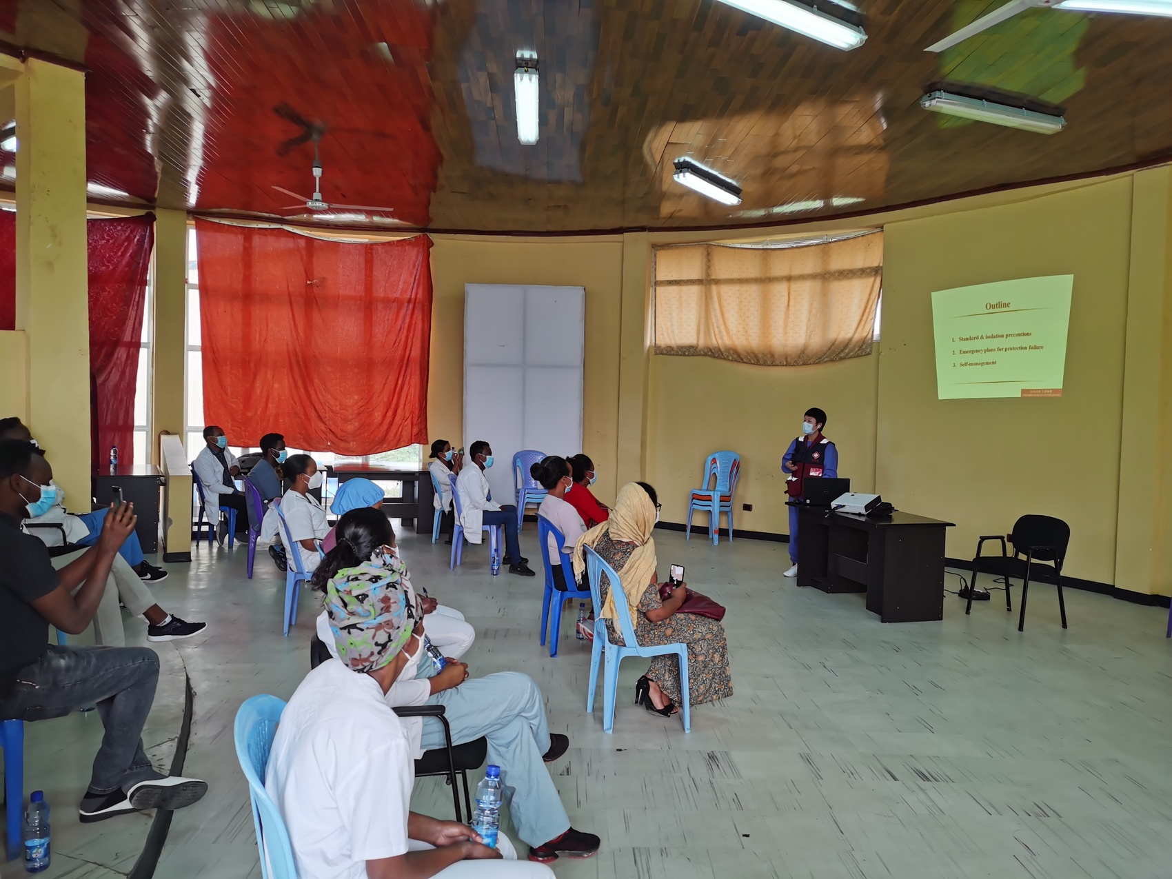 蒋艳因地制宜优化防护用品方案,鼓励当地医护人员就地取材,利用透明塑料袋、透明塑料板等物资自制防护用品,发动本土企业生产防护物资缓解防护用品短缺危机,还为埃塞俄比亚、吉布提等周边国家170多家医疗机构的医护人员详细讲解高风险呼吸治疗操作中安全防护难点及重点,讲解个人防护实施要点,教会当地医护人员在物资缺乏的情况下如何保障安全,为当地制定防护意外和职业暴露的应急预案。