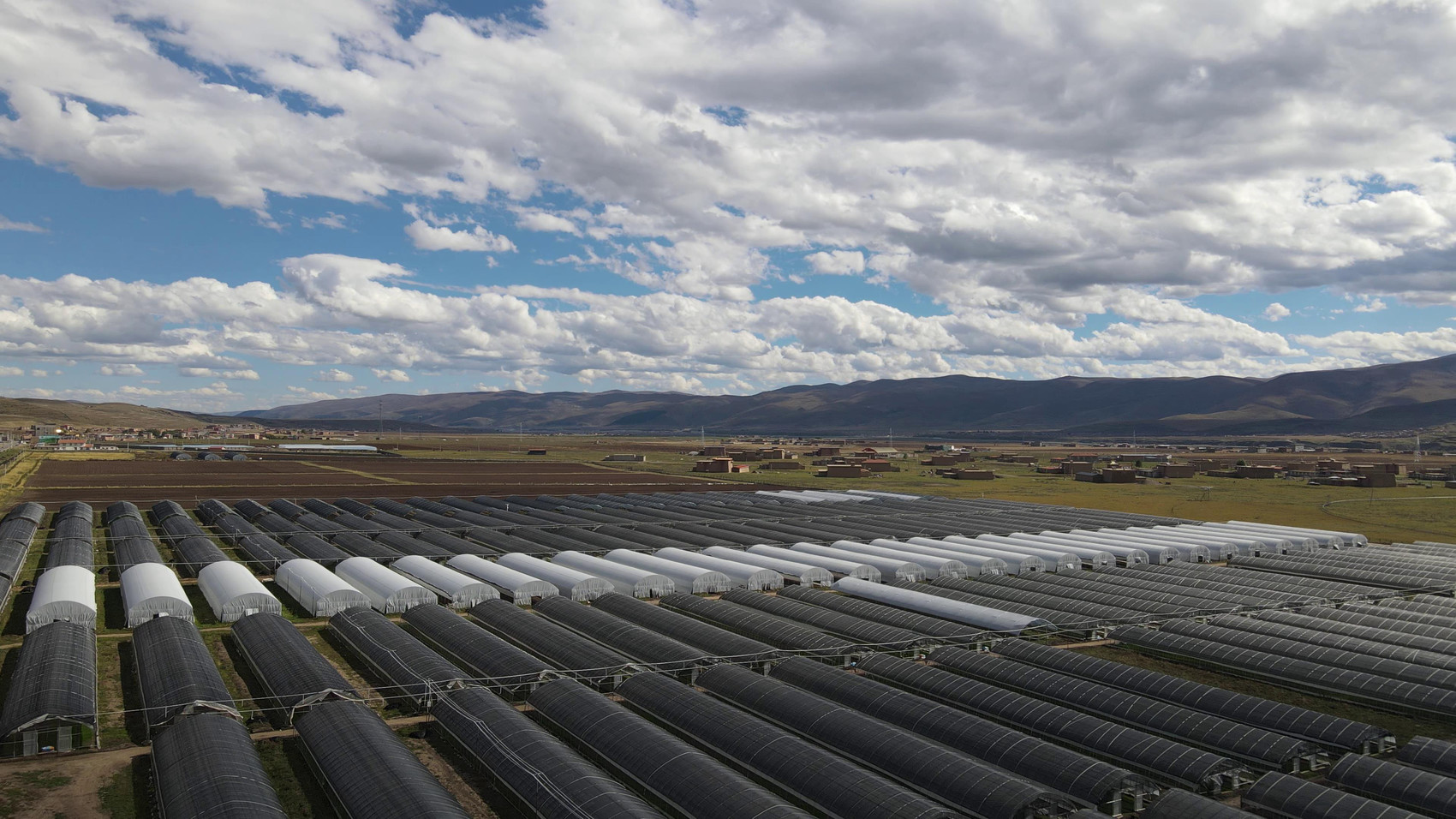 阿坝县各莫镇哈拉玛村道地中药材种植基地的一排排大棚。