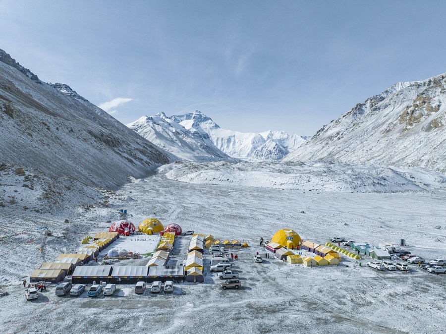 This aerial photo taken on May 23, 2023 shows the mountaineering base camp in the Qomolangma National Nature Reserve in southwest China's Tibet Autonomous Region. (Xinhua/Sun Fei)