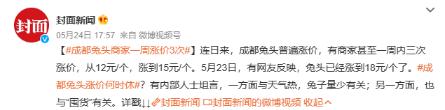报道中提到,4月底,成都街头的兔头普遍涨价,每个兔头的价格普遍卖到了15元或者16元。有商家甚至一周内三次涨价,从12元/个,涨到15元/个。对于涨价的原因,商家们纷纷表示,是原材料价格上涨。