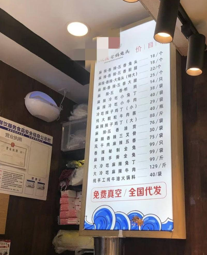 在宽窄巷子,景区内的兔头价格普遍在20元/个,而景区外的店,价格则在15元/个或16元/个。