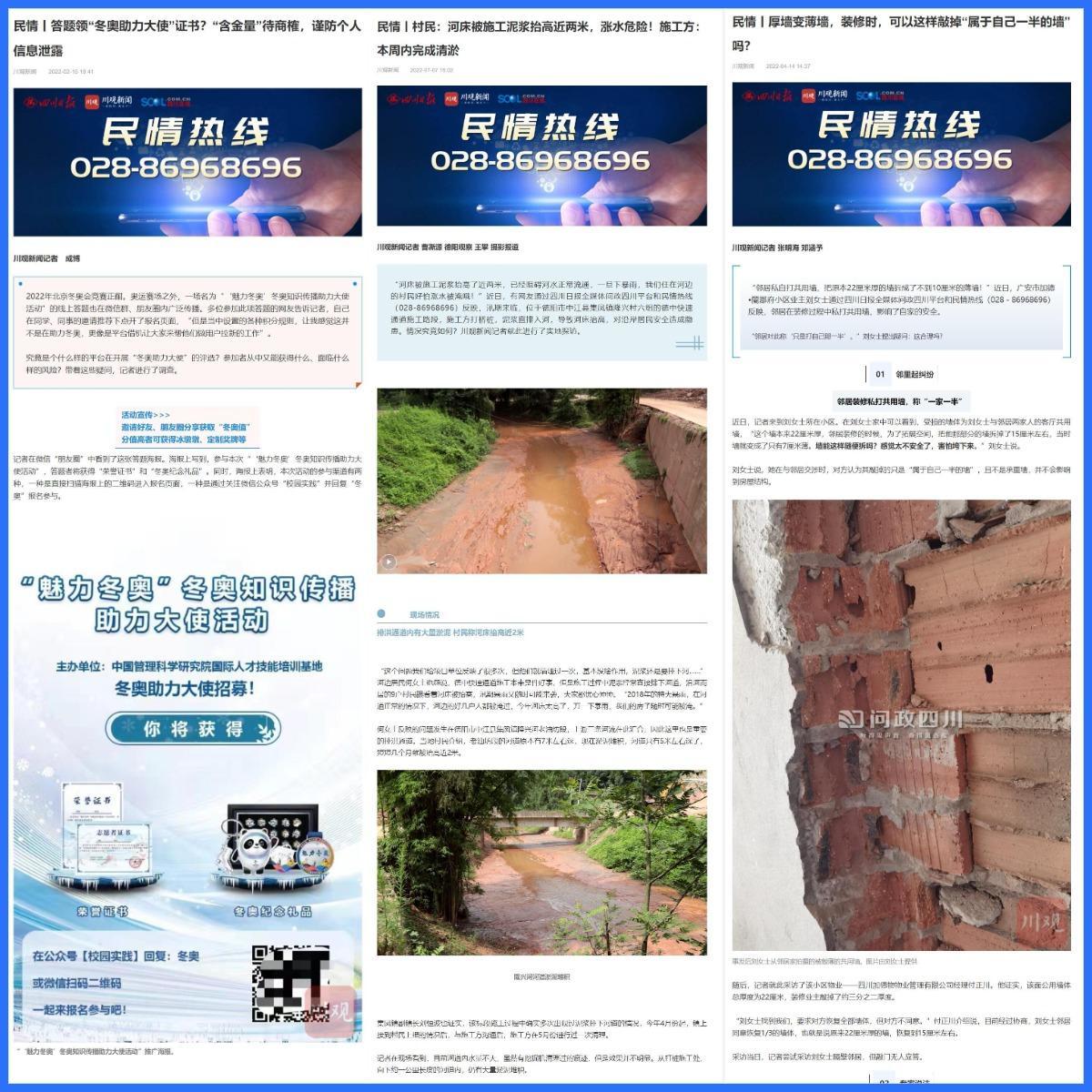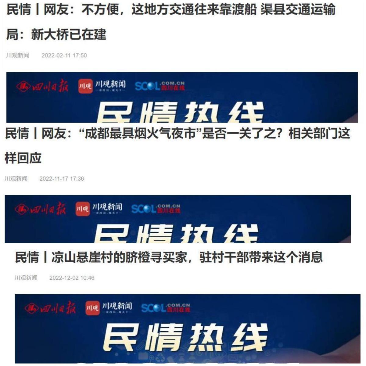 充分用好“民情热线”平台,推出《民情丨网友:不方便,这地方交通往来靠渡船 渠县交通运输局:新大桥已在建》《民情丨凉山悬崖村的脐橙寻买家,驻村干部带来这个消息》等融媒产品,跟踪报道各行各业民生动态。推出“健康四川”“应急与安全”“环保视线”等民生专题,刊发《2022年四川省30件民生实事亮点解读》《试行个人养老金 事关你我这些权益》等深度报道,反映群众建议呼声,回应群众诉求。