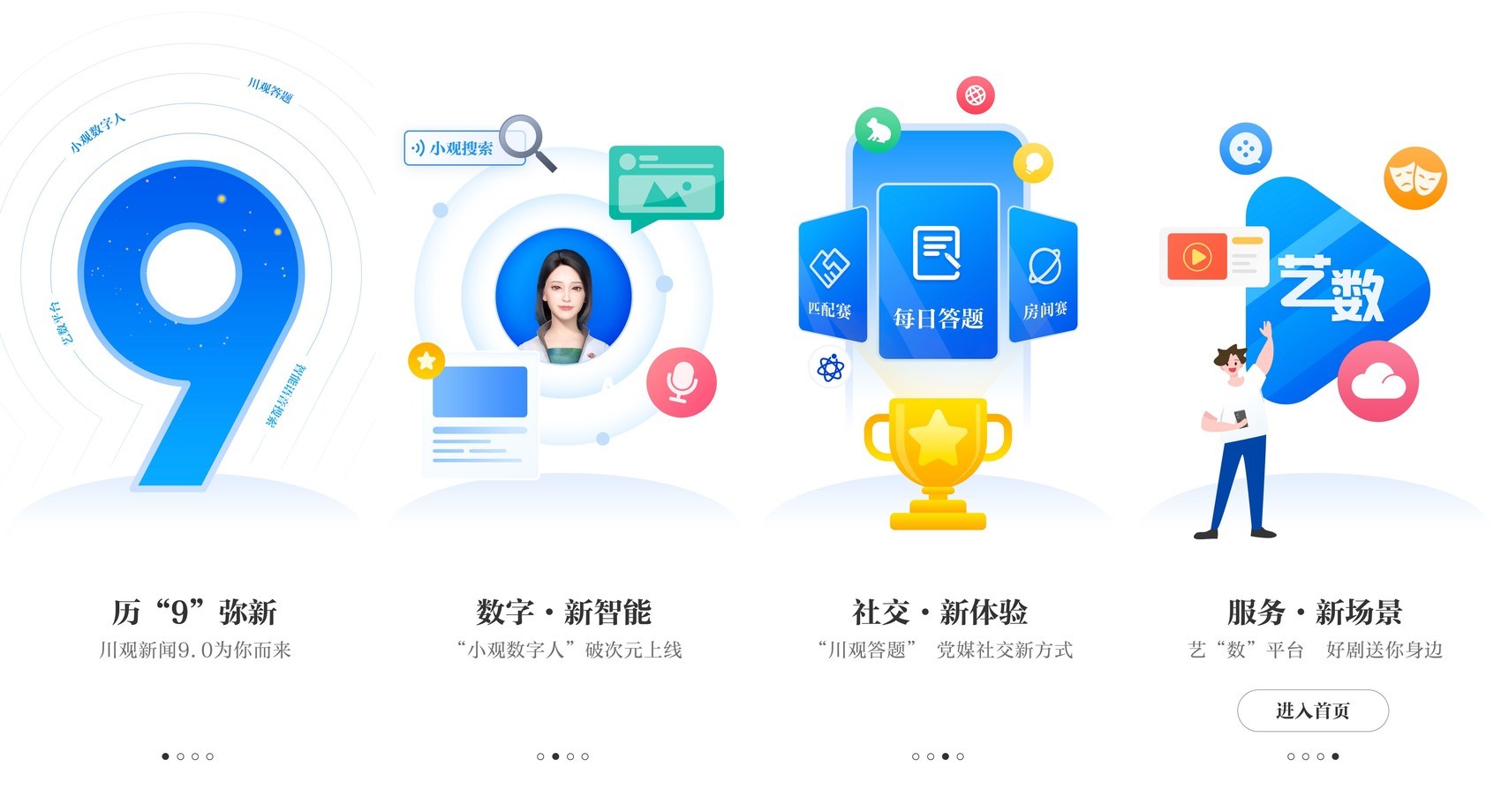 突出社交化传播、精准化分发,提升主流价值传播实效。推出数字人记者“小观”参与内容生产,实现播报新闻、虚拟主持、互动直播、交互搜索、用户服务等全智能视频服务。运用5G、互联网、大数据、云计算、元宇宙等新技术,打造川观新闻四川云·艺“数”平台,为用户提供一站式线上数字文艺活动,运营活跃人次超20亿。“川观答题”营造沉浸式社交化学习场景,吸引答题人次超1.5亿,覆盖全省120个省直机关、21个市(州)、183个县(市、区)、110家中央及省属国企、130所高校、16270家基层党组织。