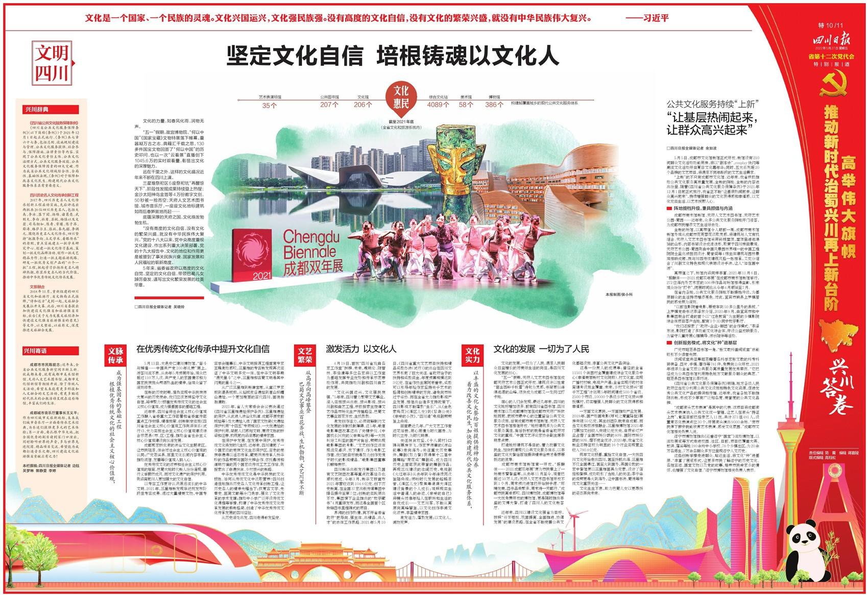 持续关注非遗传承、文博考古等重大事件,让中华优秀传统文化活起来。发起征集“我为冬奥写首诗”活动,举办“我与四川日报70年”征文活动,恢复中断20年的四川日报川观文学奖评选,川观新闻四川云·艺“数”平台推出约50场文化直播,与杜甫草堂等文化单位合作开展阿来“杜甫 成都 诗”等名家讲座,用阅读传播经典,用书香点亮生活。推出数字文化潮、新360行、我是设计师、我在四川修文物、非遗传承人、二十四节气里的巴山蜀水等系列策划报道,联合河南日报、浙报集团共同推出“中华文明多元一体:我们的5000年”大型融媒报道,为读者揭开中华文明的瑰丽画卷。