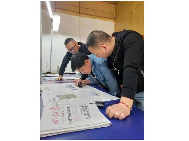 (《四川日报》印刷质量评审小组的评审员们正认真审核1、2月份南充、泸州、达州和凉山4个分印点选送的24张《四川日报》)