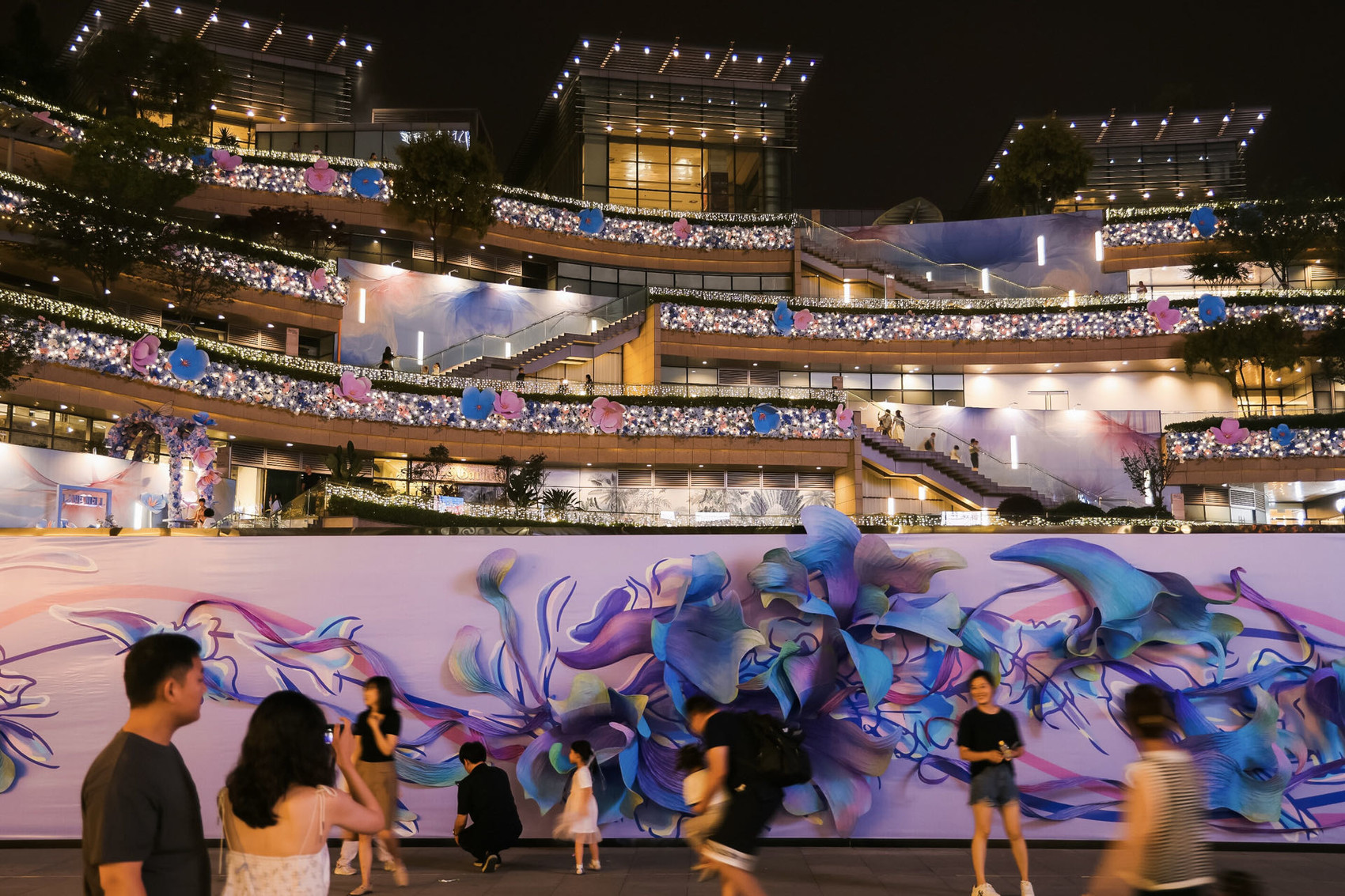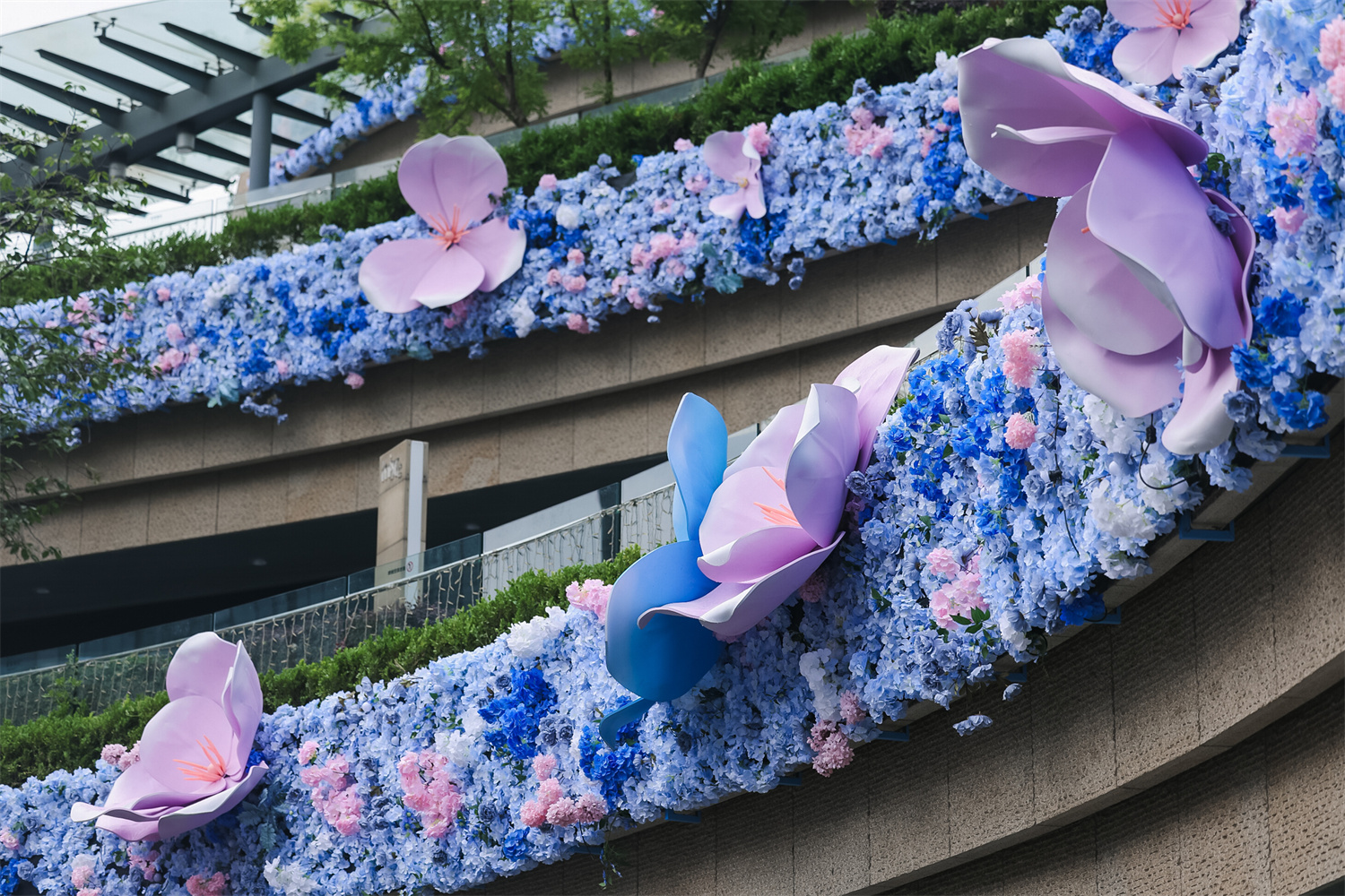 记者在现场看到,万象广场原本的墙体围挡摇身一变成为“写意花墙”,延绵的“花朵”如烟火绽放,极具梦幻视觉;抬头望向横跨4层楼的“梦境花田”,紫色、粉色花卉拥簇着,倚靠在层层退台式的建筑外表,呈现出梯田一般的花田景观——一座“垂直花园”,为今年“六一”提前装点上梦幻的公共艺术氛围。据悉,这两处艺术主题装置将分别限时亮相至6月13日和9月30日。