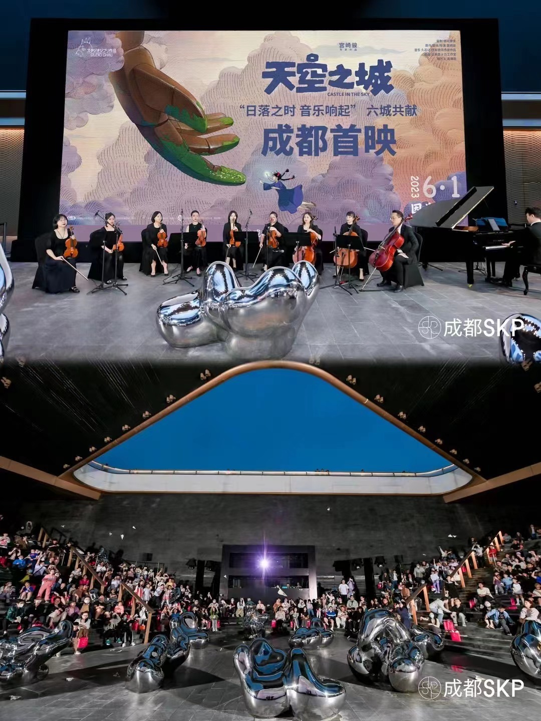 成都SKP带来崭新的生活方式体验,于5月21日晚举办《天空之城》成都首映礼,在花园与下沉式广场融合的户外区域,伴随四川爱乐乐团奏响《天空之城》的旋律,一众小朋友与爸爸妈妈在落日时分一同沉浸于动画观影体验。