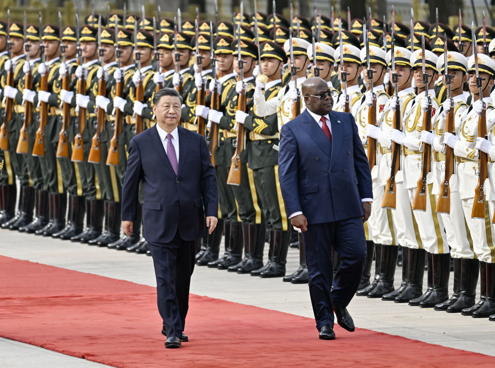 5月26日下午,国家主席习近平在北京人民大会堂同来华进行国事访问的刚果(金)总统齐塞克迪举行会谈。这是会谈前,习近平在人民大会堂东门外广场为齐塞克迪举行欢迎仪式。新华社记者 刘彬 摄