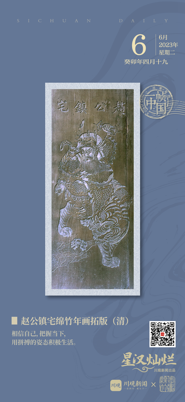 绵竹人称这种年画为黑货,好的拓片作品呈现出墨色均匀,图案清晰,十分爽目,墨色透亮,线条清朗,刀法考究,古雅迷人。位于四川德阳绵竹的绵竹年画博物馆内至今还保留十几块样式的清代拓片版,内容多为山水、花鸟、神像及名人字画。如《紫微高照》《蟾宫折桂》《赵公镇宅》《万宝来临》等,均为国家二级文物,也是该馆的镇馆之宝。从这些拓片中,我们也能一窥绵竹年画的发展历史与丰富内涵。