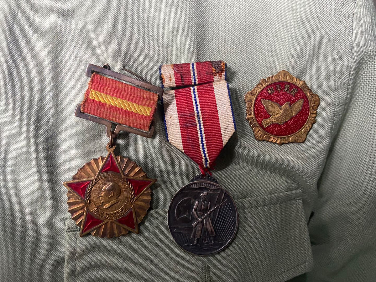 陈思龄将抗美援朝战争时期获得的徽章,挂在胸前。郭慧琳摄