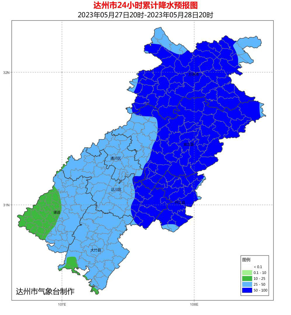 5月27日下午,达州市气象台继续发布暴雨蓝色预警:预计27日夜间至28日,达州市还将出现一次强降雨天气过程,万源、宣汉、开江、达州东部经开区大到暴雨,局地雨量可达100毫米及以上,其余地方中到大雨。最大小时雨强20—40毫米,强降雨主要集中在28日凌晨至上午。