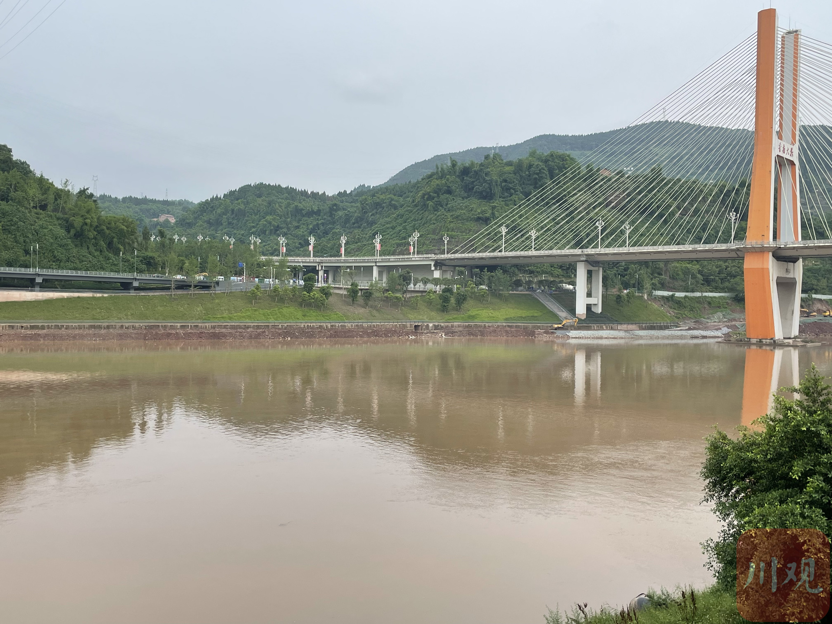 渠江支流州河达州城区段河水泥黄浑浊,水流加快