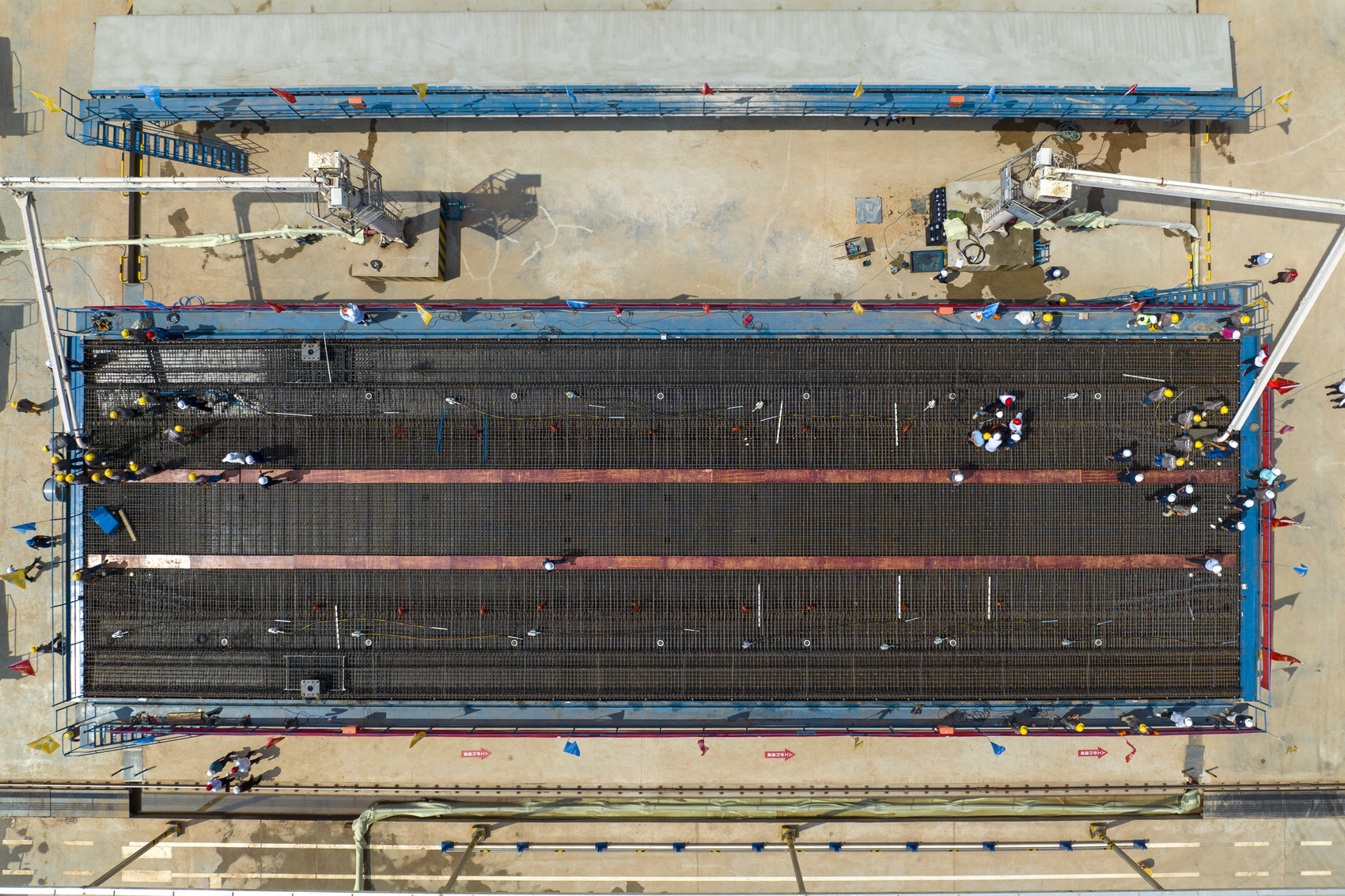 虽然箱梁长度只增加了8米,但预制40米梁带来的难题是一系列的。比如,浇筑时间更长,从4—5小时变为5—6小时,对混凝土性能要求更高;梁体重量超过900吨,较32米梁重了200吨左右,运输、提梁、架梁设备都相应“提档升级”,从900吨级增加到1000吨级。