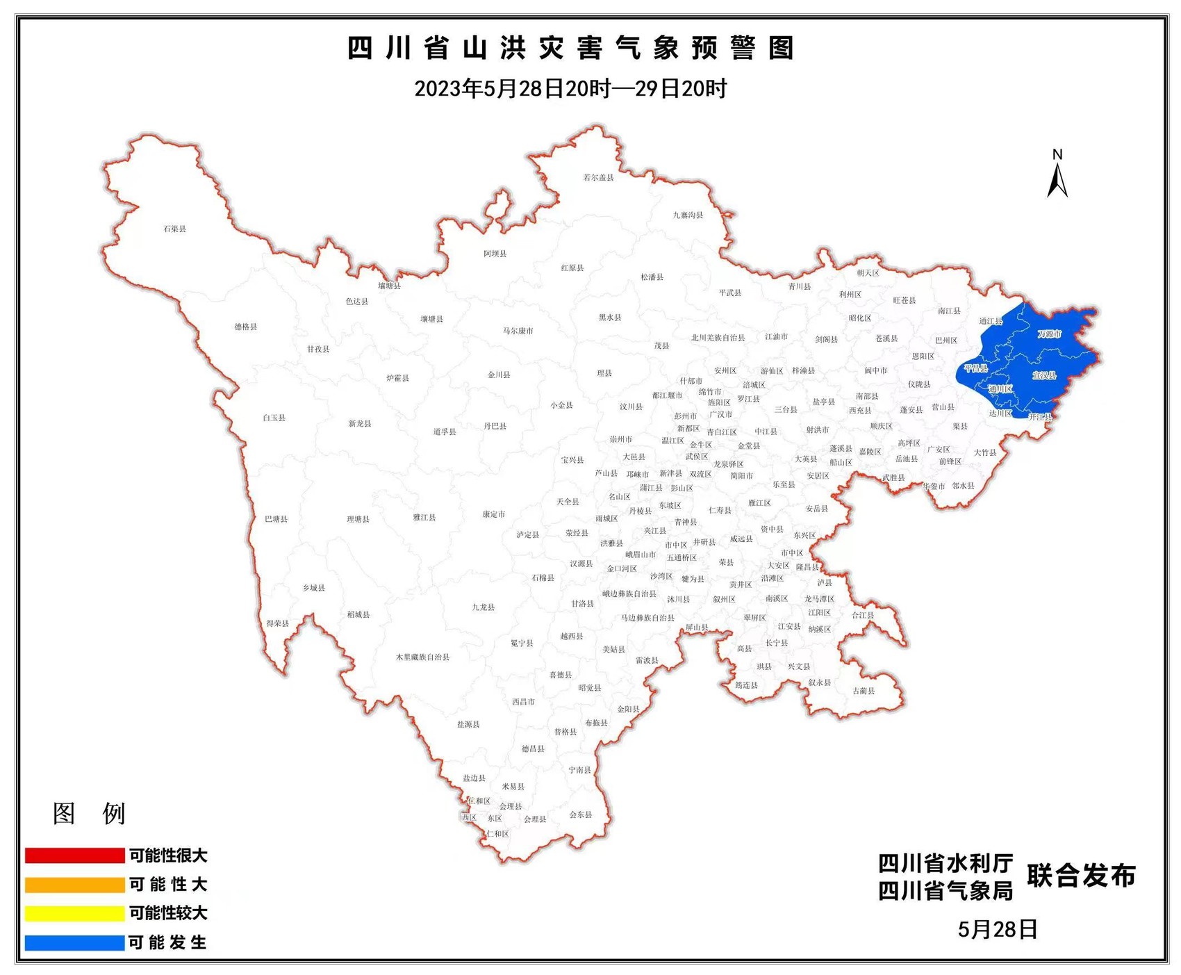 5月28日17时,四川省水利厅、四川省气象局联合发布山洪灾害蓝色预警。预警信息显示:5月28日20时至29日20时,达州市宣汉县、万源市、开江县、达川区、通川区,巴中市平昌县、通江县等7县(市、区)可能发生山洪灾害。