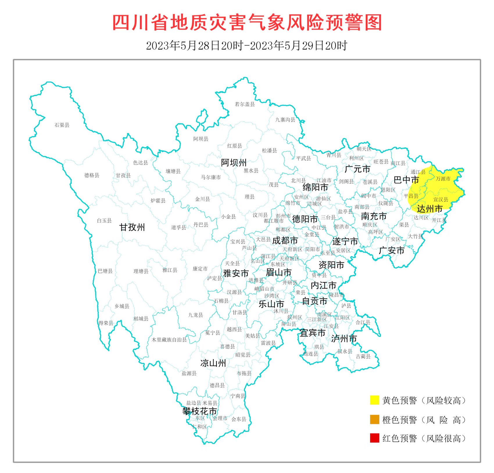 5月28日,四川省地质灾害指挥部办公室发布全省地质灾害气象风险预警。结合四川省气象台天气预报情况,5月28日20时至5月29日20时,全省地质灾害气象风险黄色预警区域为:巴中通江县、平昌县,达州通川区、达川区、万源市、宣汉县等2市6个县(市、区)。