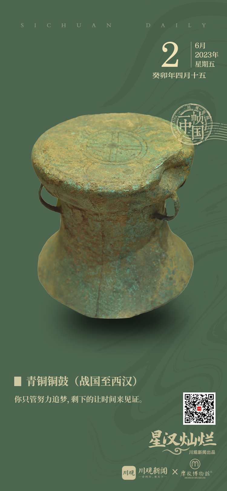 青铜铜鼓于1988年12月,由凉山州博物馆和盐源县文化馆在盐源县双河乡毛家坝老龙头墓葬群抢救发掘时出土。该鼓由青铜浇铸而成,胴部突出、腰部收缩,口为喇叭形,面小于口,在胴腰处有四个桥状铜耳,显得精巧而别致。铜鼓之上有几处修补痕迹。