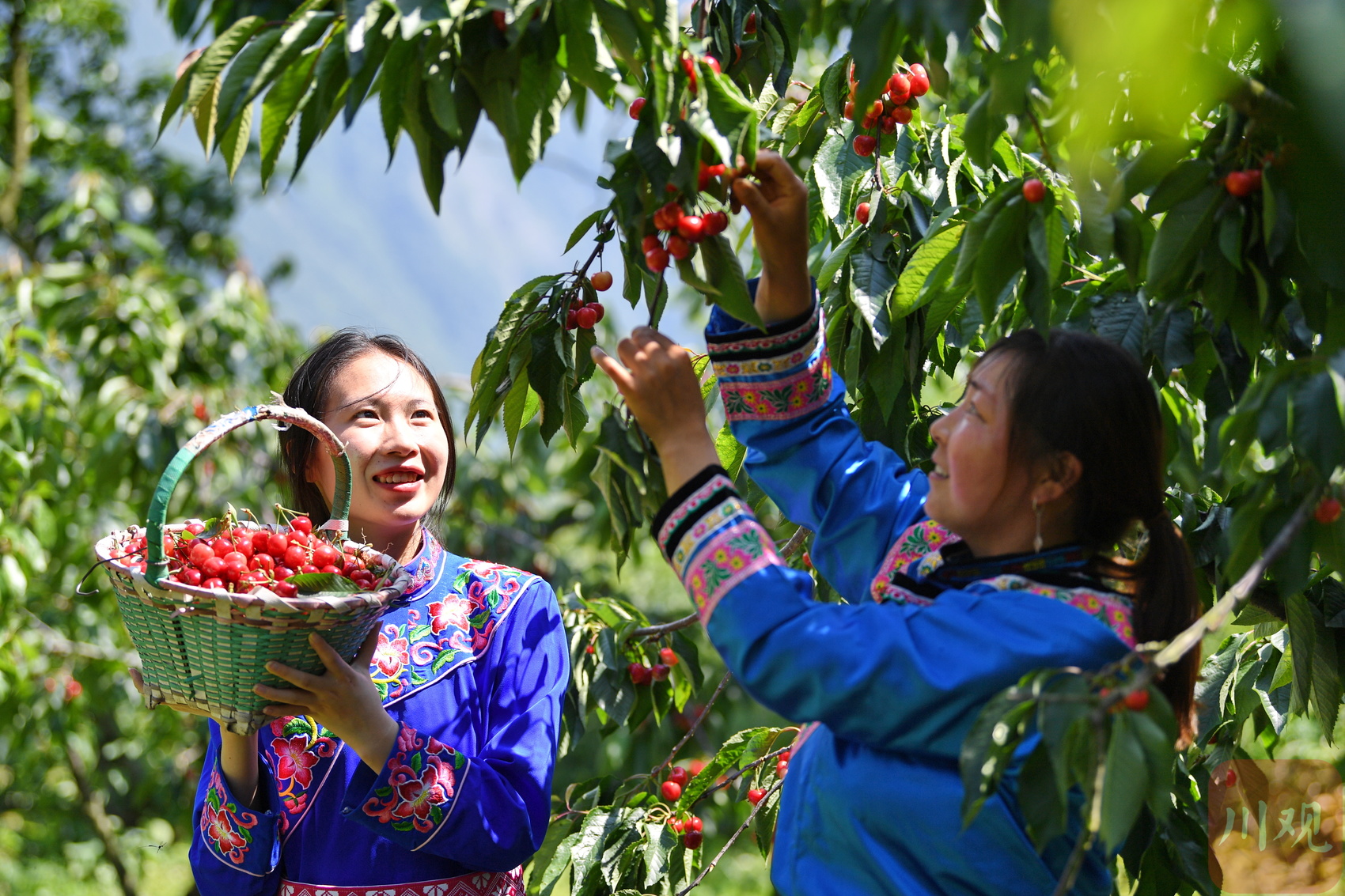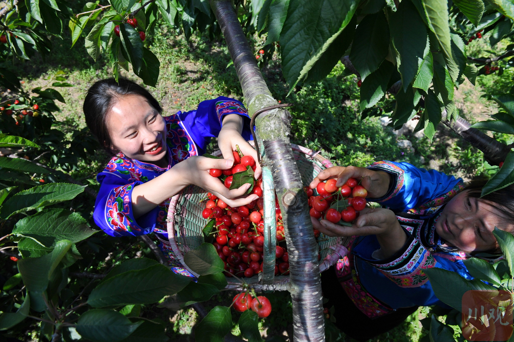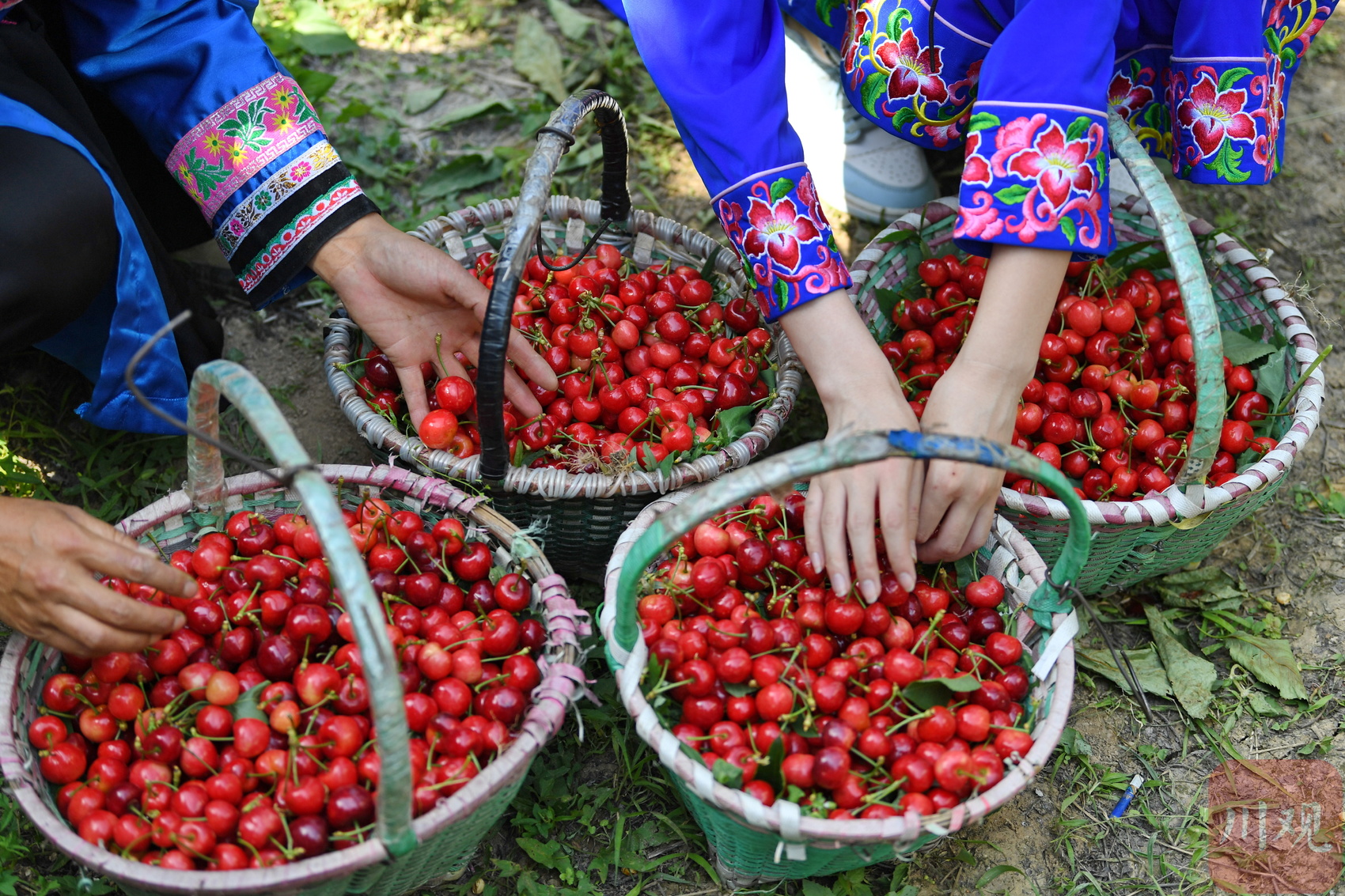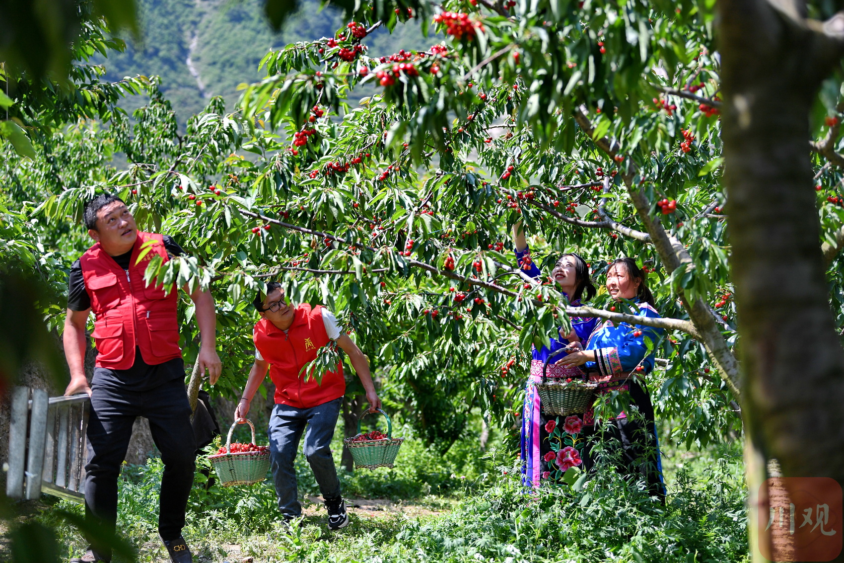 眼下正是阿坝州汶川县近3万亩车厘子成熟的季节。5月30日,在汶川县绵虒镇三官庙村车厘子种植基地,满树火红的车厘子映入眼帘,当地通过“党旗红+志愿红”组织党员志愿者开展帮助采摘、电商销售、交通疏导等志愿服务,助农增收。