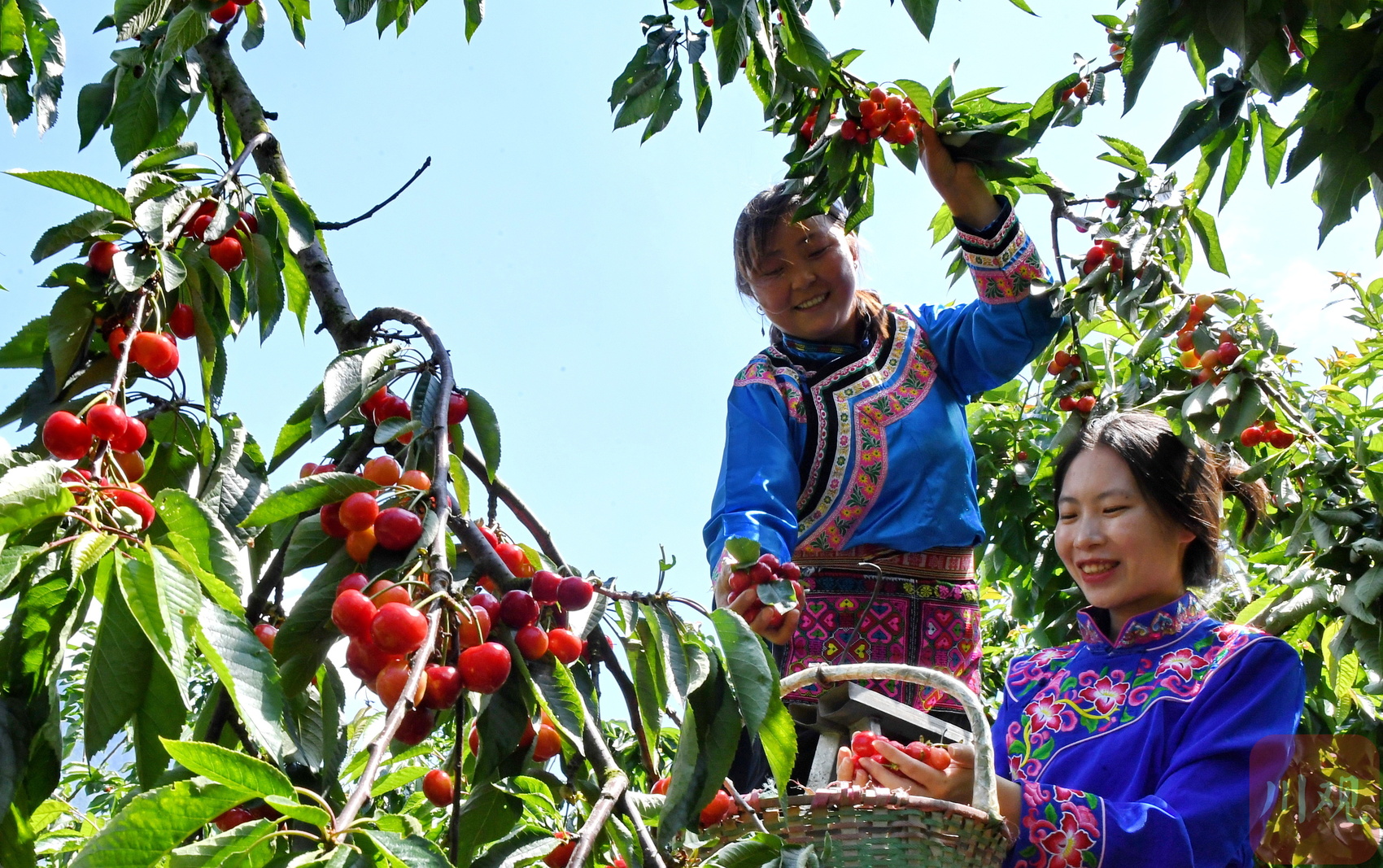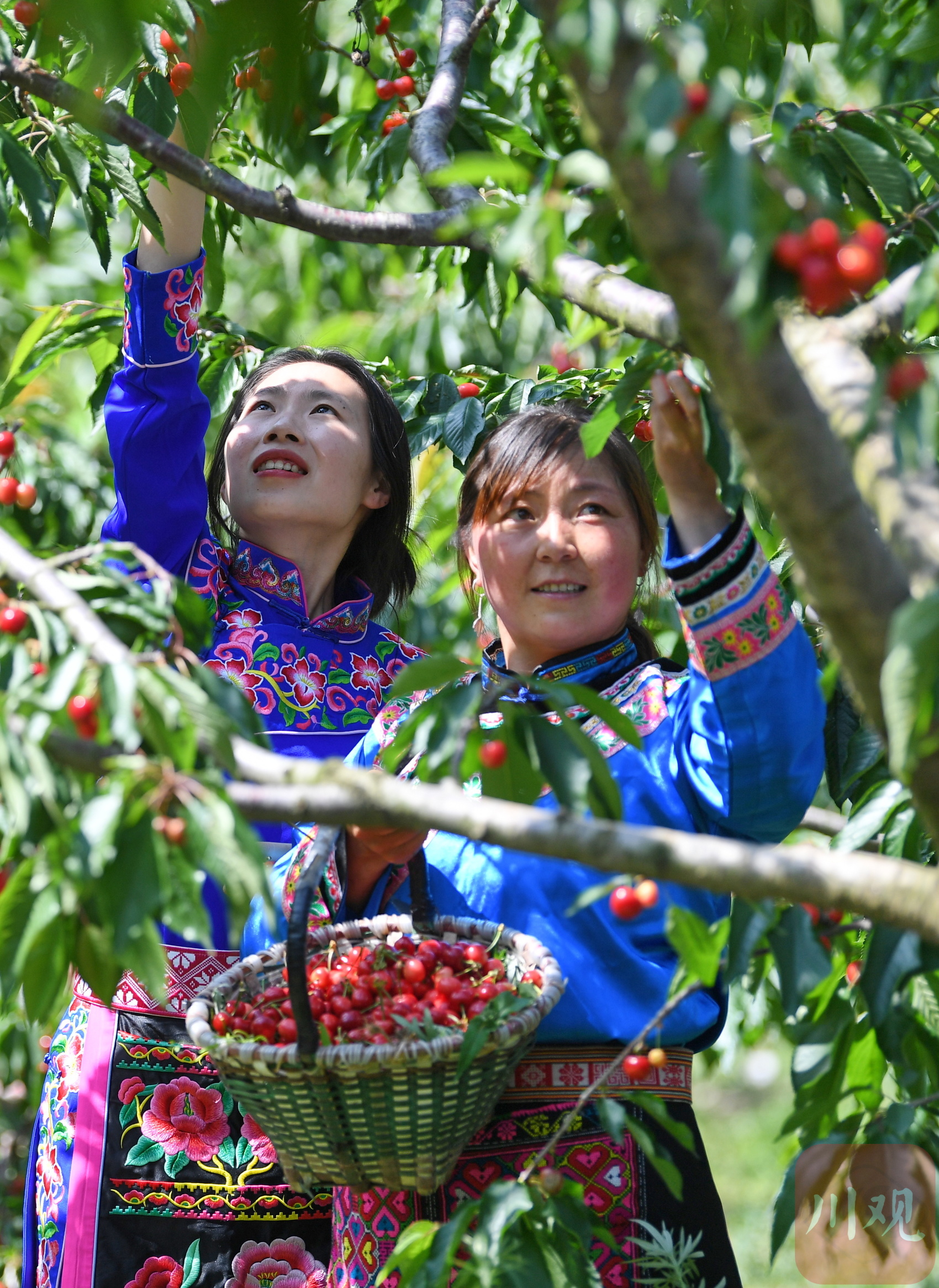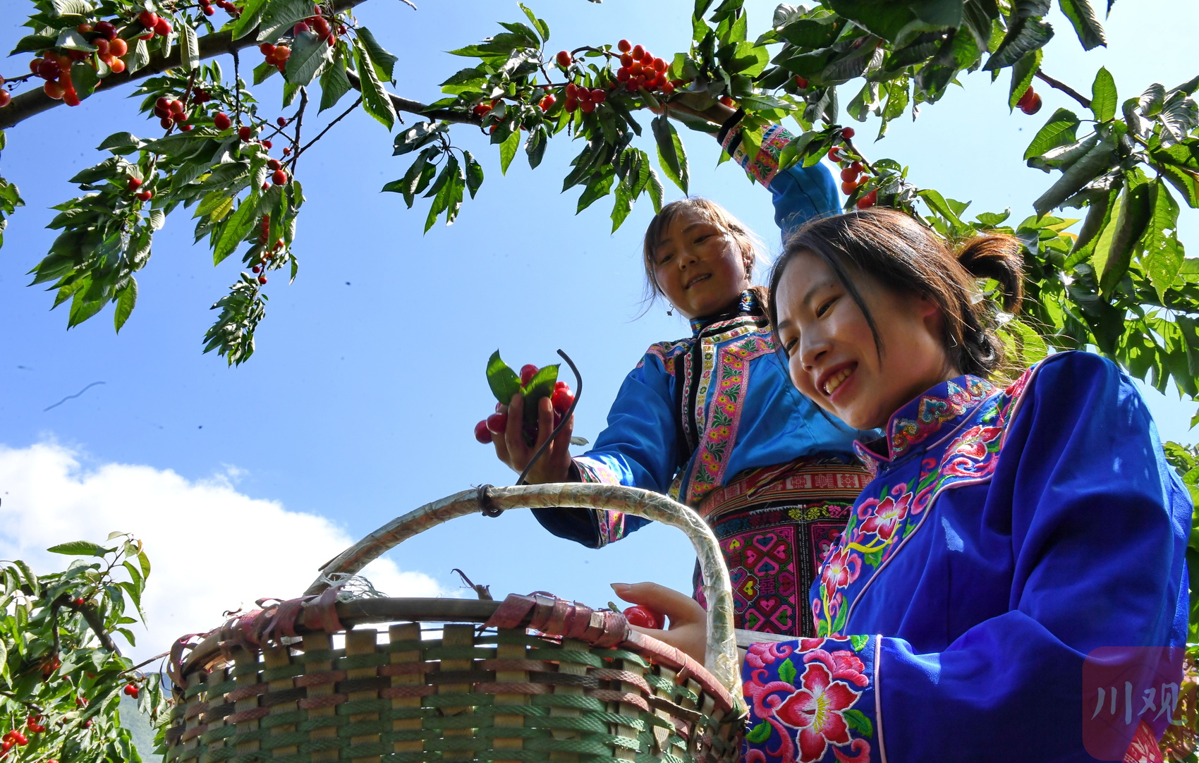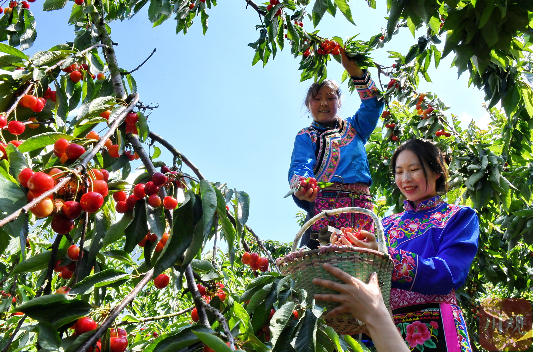 眼下正是阿坝州汶川县近3万亩车厘子成熟的季节。5月30日,在汶川县绵虒镇三官庙村车厘子种植基地,满树火红的车厘子映入眼帘,当地通过“党旗红+志愿红”组织党员志愿者开展帮助采摘、电商销售、交通疏导等志愿服务,助农增收。