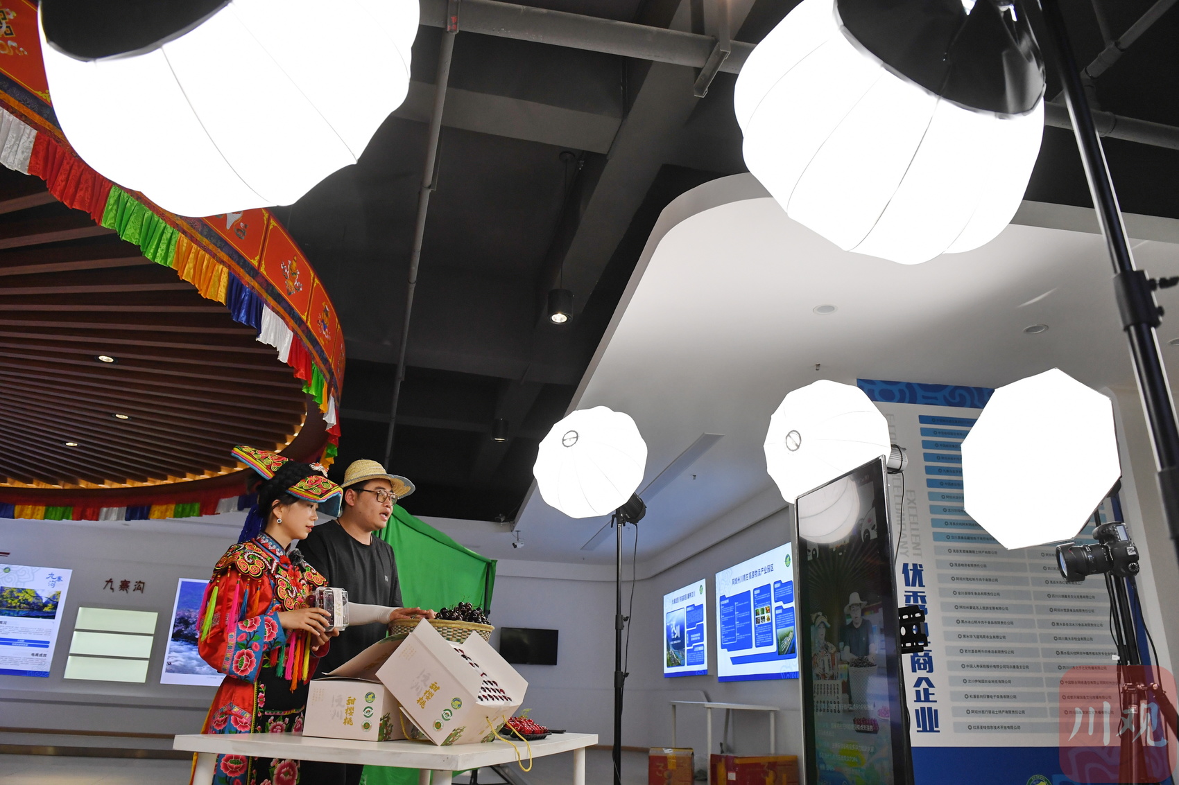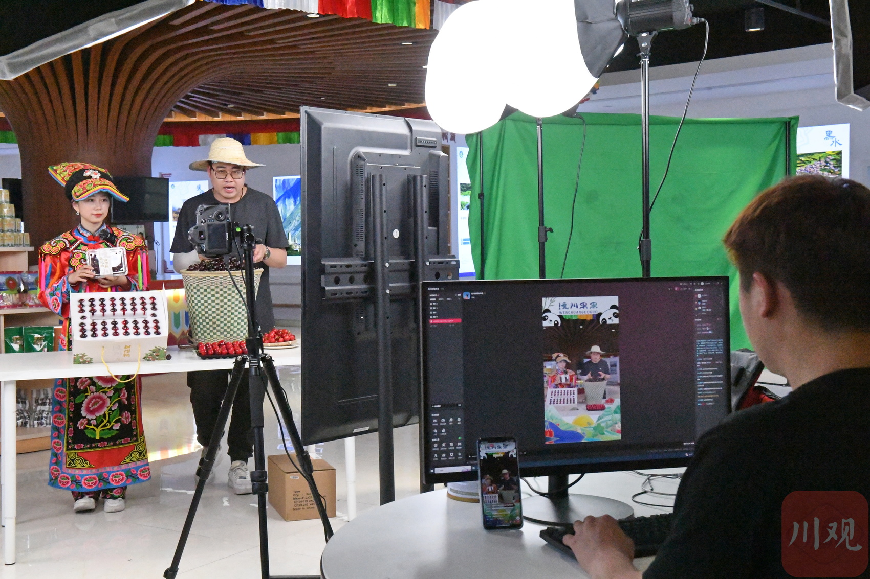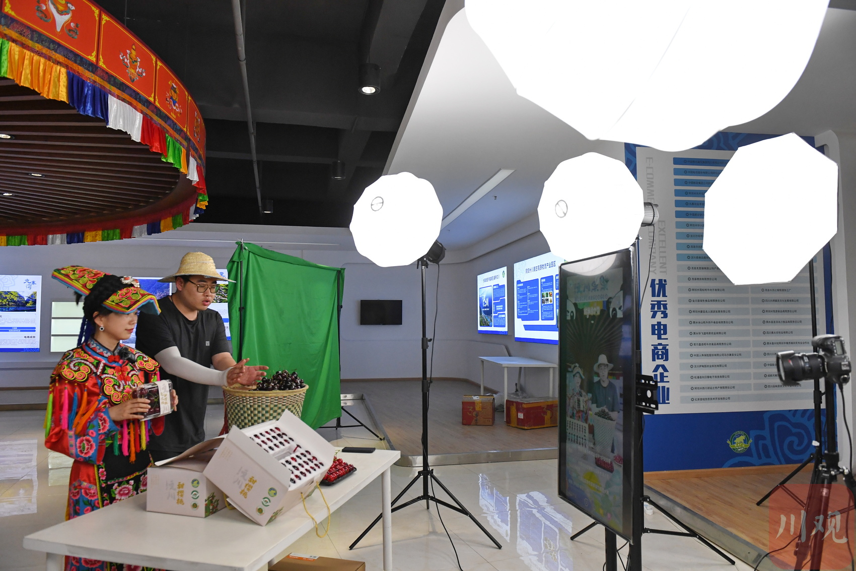 5月29日,在阿坝藏族羌族自治州汶川果果电商平台选品中心,当地主播通过网络销售汶川车厘子。