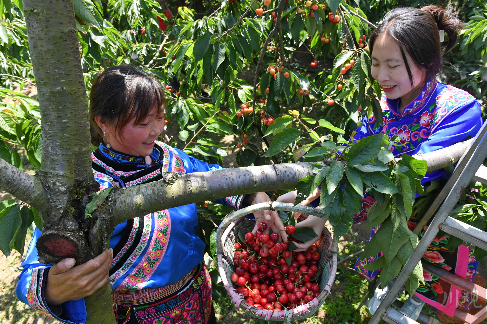 5月29日,在阿坝藏族羌族自治州汶川县绵虒镇三官庙村,当地村民采摘车厘子。