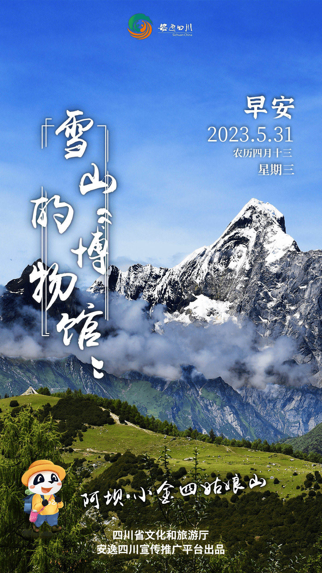 5月31日,星期三。今日安逸四川日历海报走进阿坝小金四姑娘山,带大家感受这座雪山的“博物馆”。